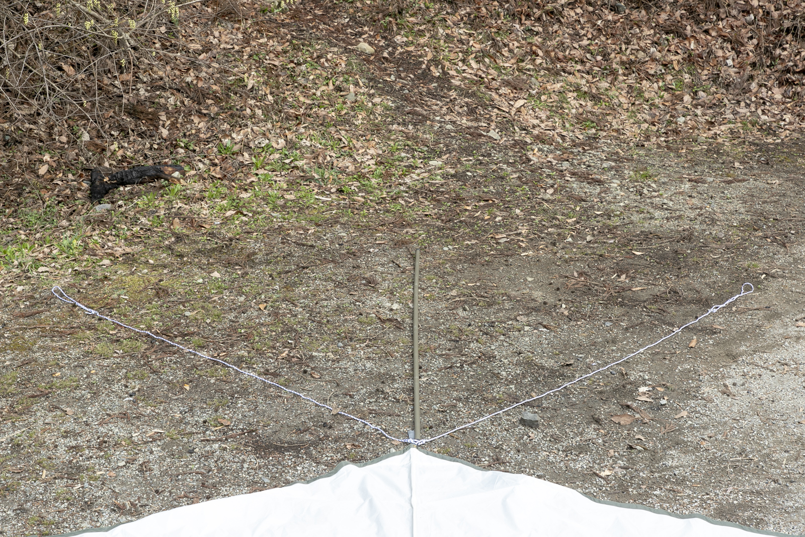 ポールを中心にして張り綱をそれぞれ45度程度になるよう伸ばします。メインポールの先端くらいがペグの位置となります。