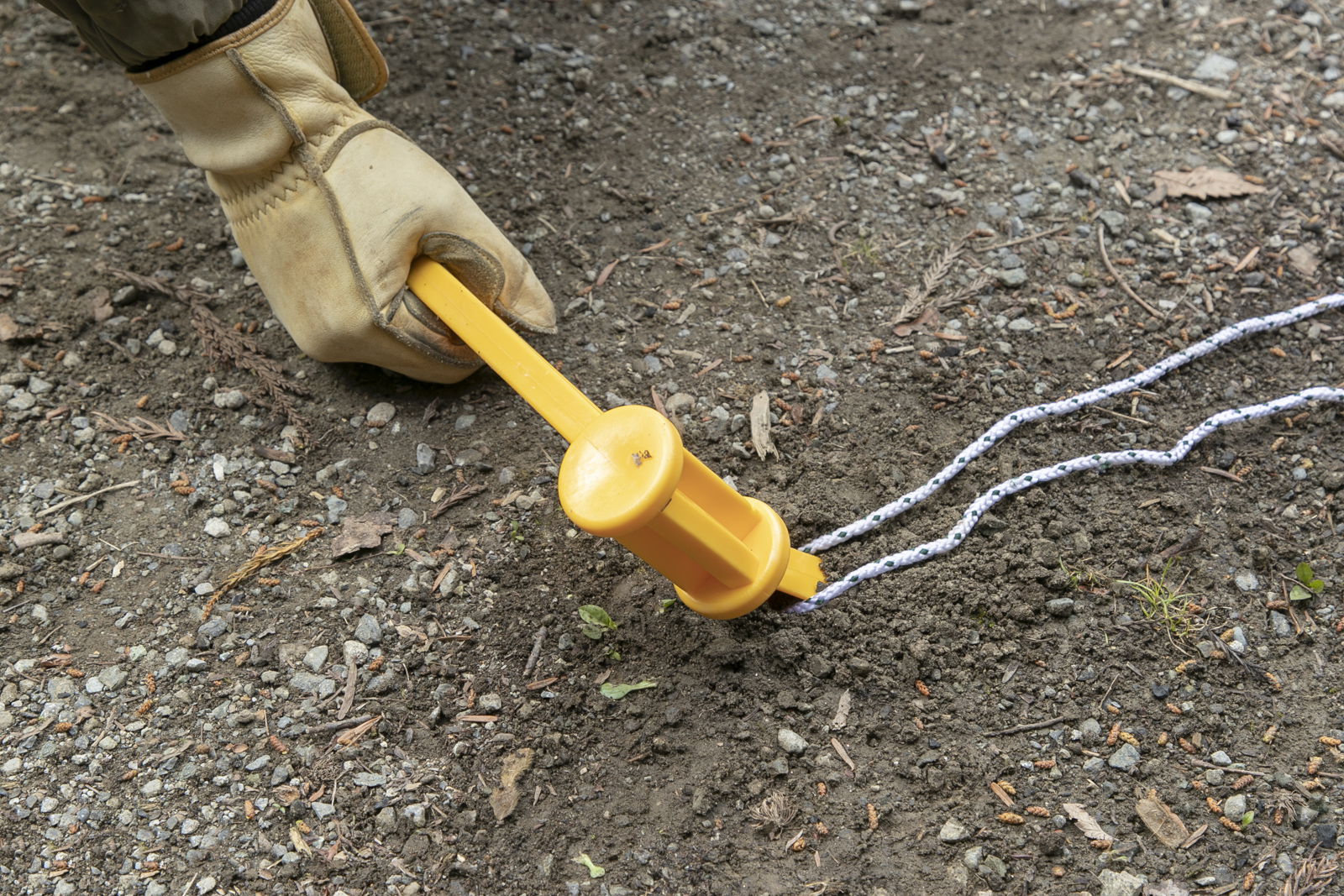 ペグを地面に差します。最初は張り綱をはずした状態でペグハンマーを使うと、空振りしても張り綱を叩くことはなく、張り綱へのダメージはありません。