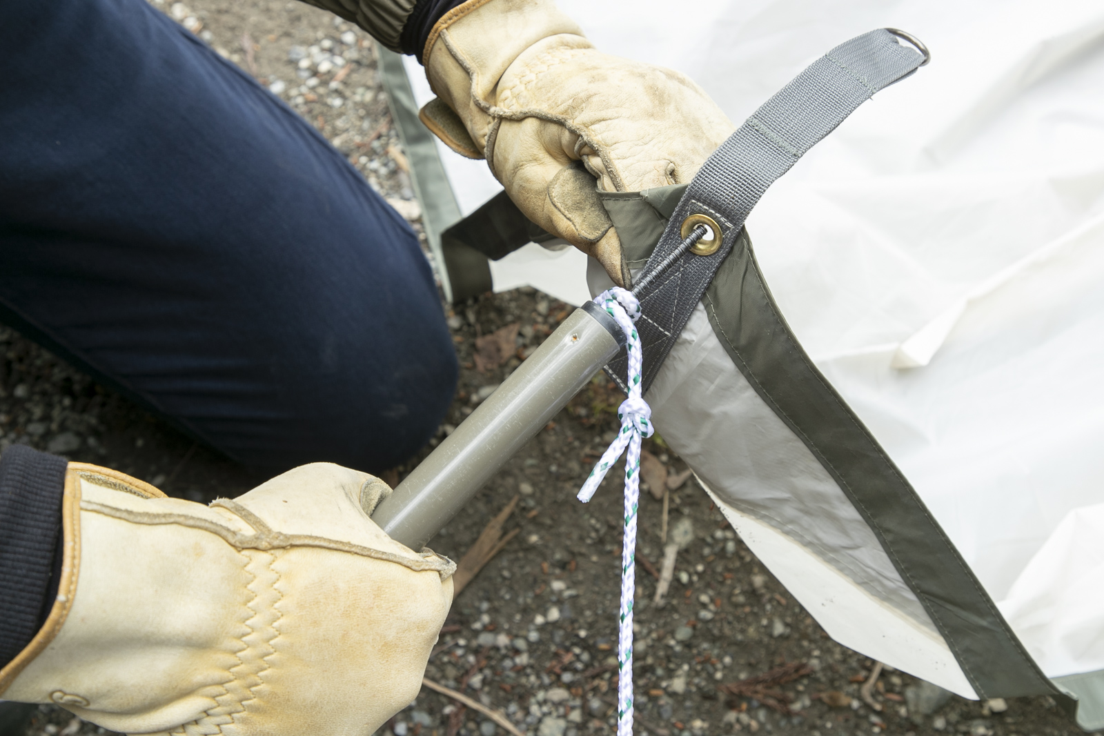 メインポールをタープのグロメット(はと目)に挿して、その上から張り綱を2本(二又の場合は1本)を引っかけます。張り綱を2重の輪にしておくと、耐風性が高くなります。
