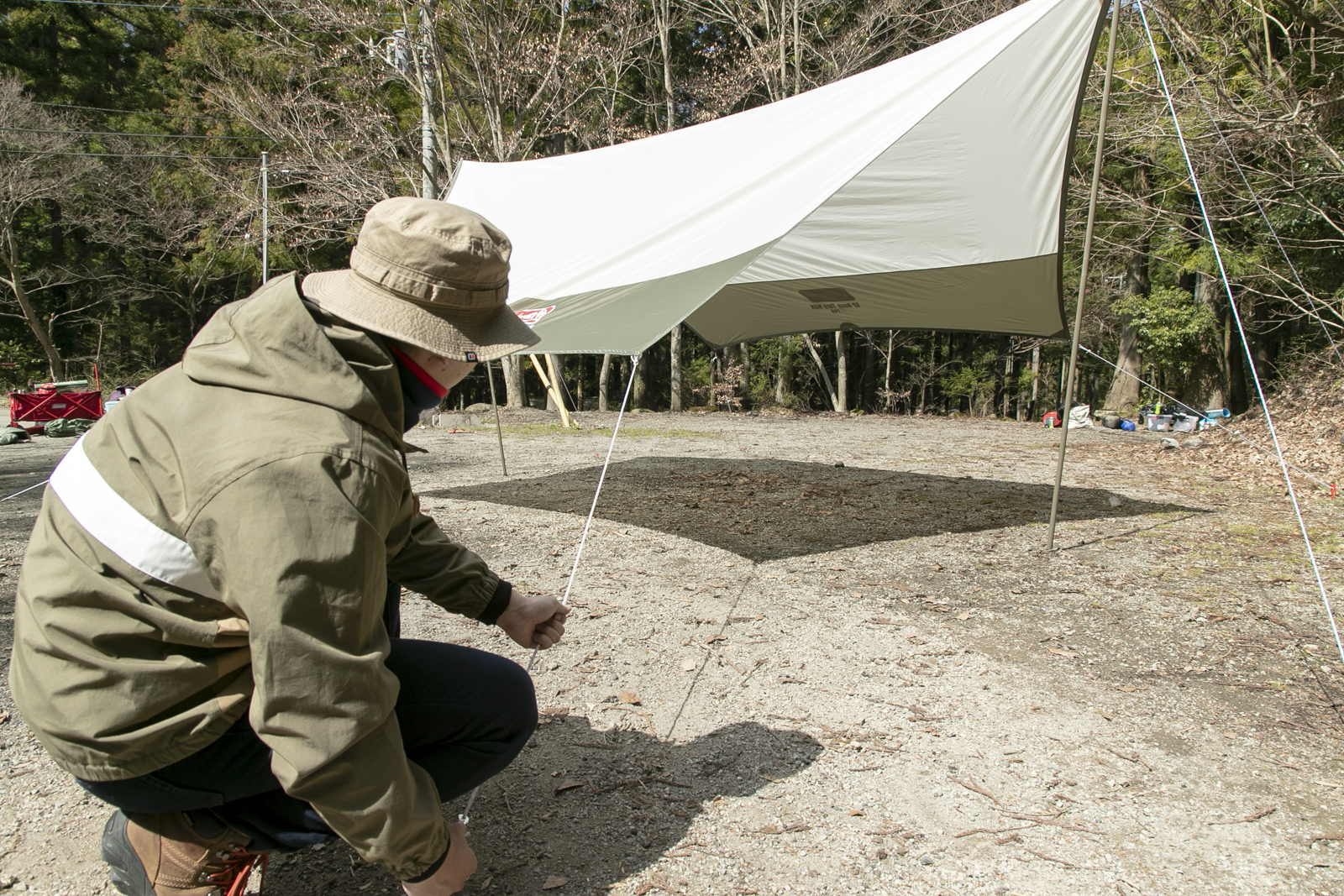 ほかの4本の張り綱を結び、ペグで地面に固定します。タープの中心からまっすぐ張り綱を伸ばすと、シワのない機能的なタープとなります。