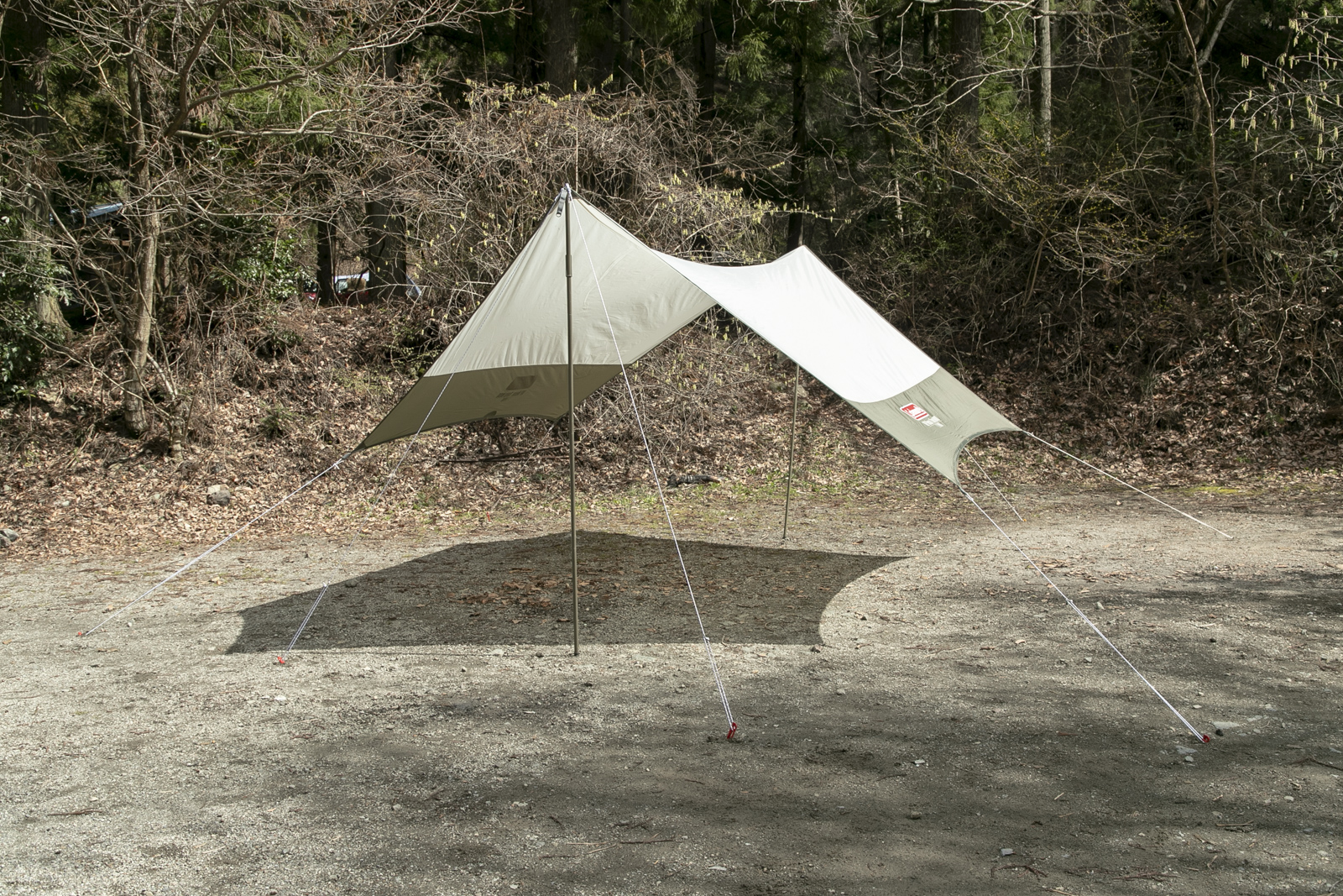 この時点でタープの稜線をまっすぐに張るものと、少しゆるめて弧を描くほうがいいものがあるので、手持ちのタープの説明書を確認してください。