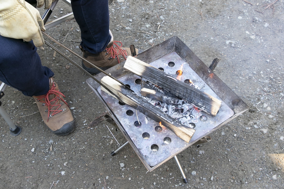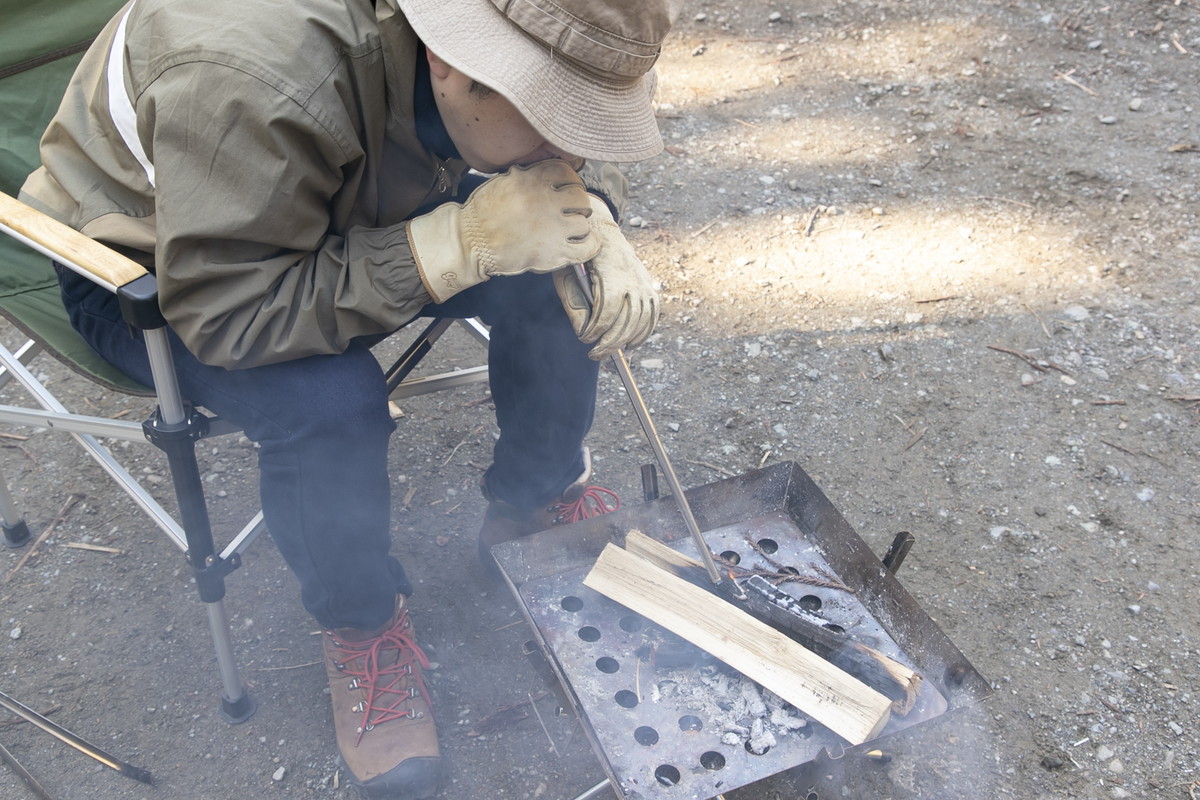 焚き火をしていると、焚き火台の火床に灰がたまって、うまく空気がはいりにくくなる場合があります。そんなときは、風を送って空気を補いましょう。