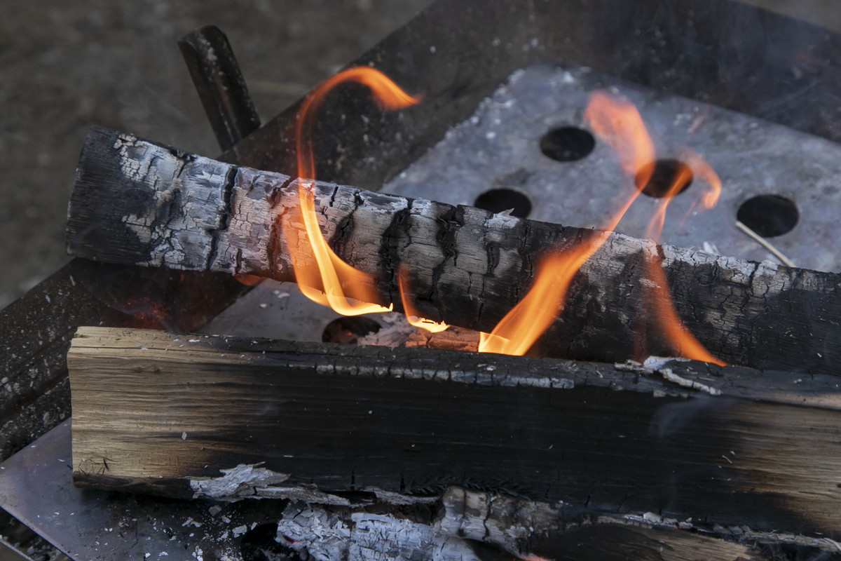 薪の表面に灰がかぶった状態は熾火といって、調理にちょうどいい状態です。ただし、灰がかぶりすぎると炎が小さくなるので、タイミングを見て表面の灰を吹き飛ばしましょう。ちなみに、鍋をかけたまま空気を送ると灰だらけになります。きちんとふたを閉めておきましょう。