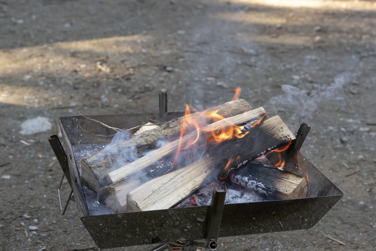 反対に、薪を平らに並べると炎の高さは落ち着きます。チロチロとした炎は地味に見えますが、長く焚き火を楽しめます。