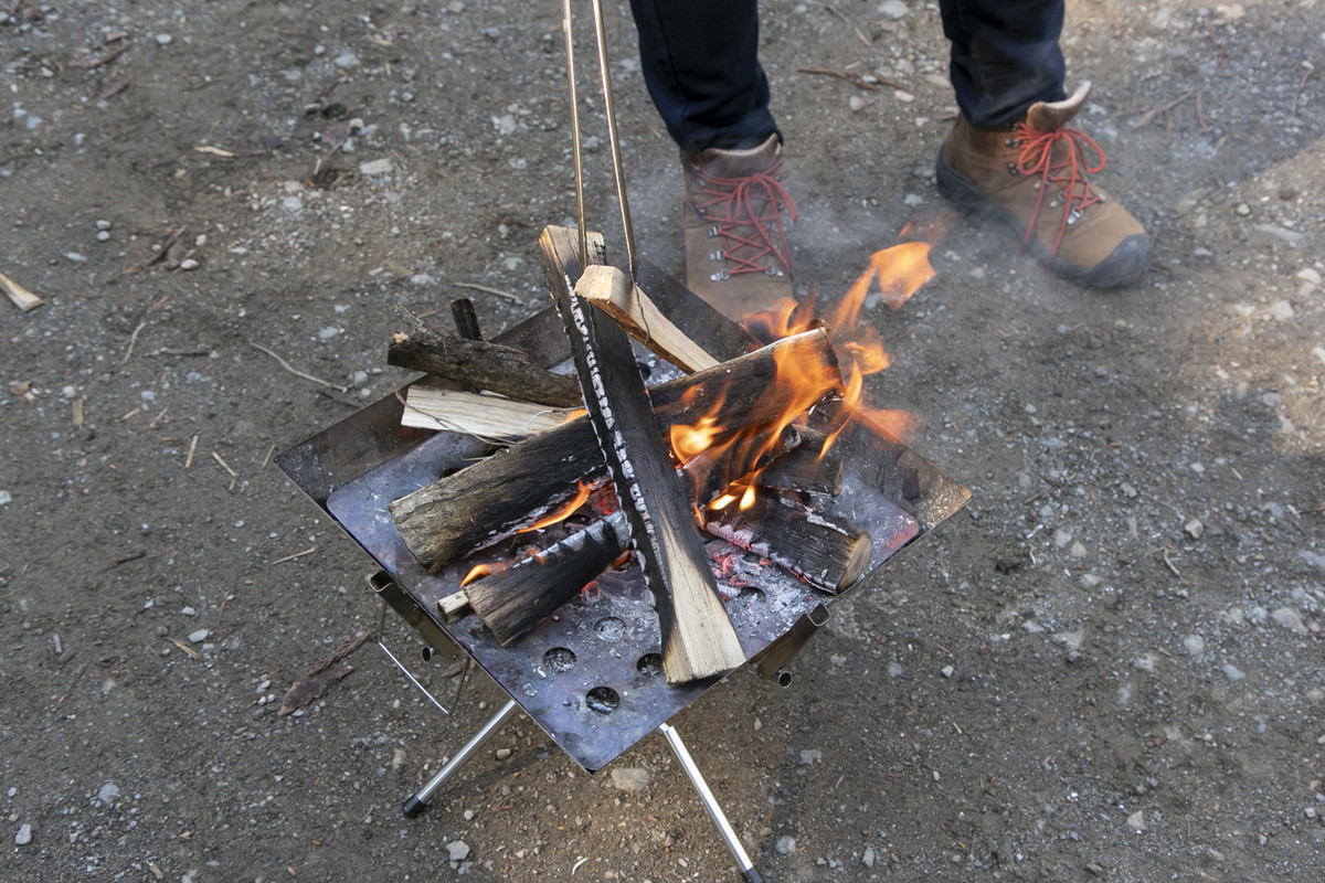 上の写真は三角錐を形作る「閉じ傘」という薪の組み方の変型で、なるべく高くなるようにしています。薪の頂点に炎が集中するので、調理の際はこの頂点の位置を調整することで、鍋に確実に炎を届けられます。