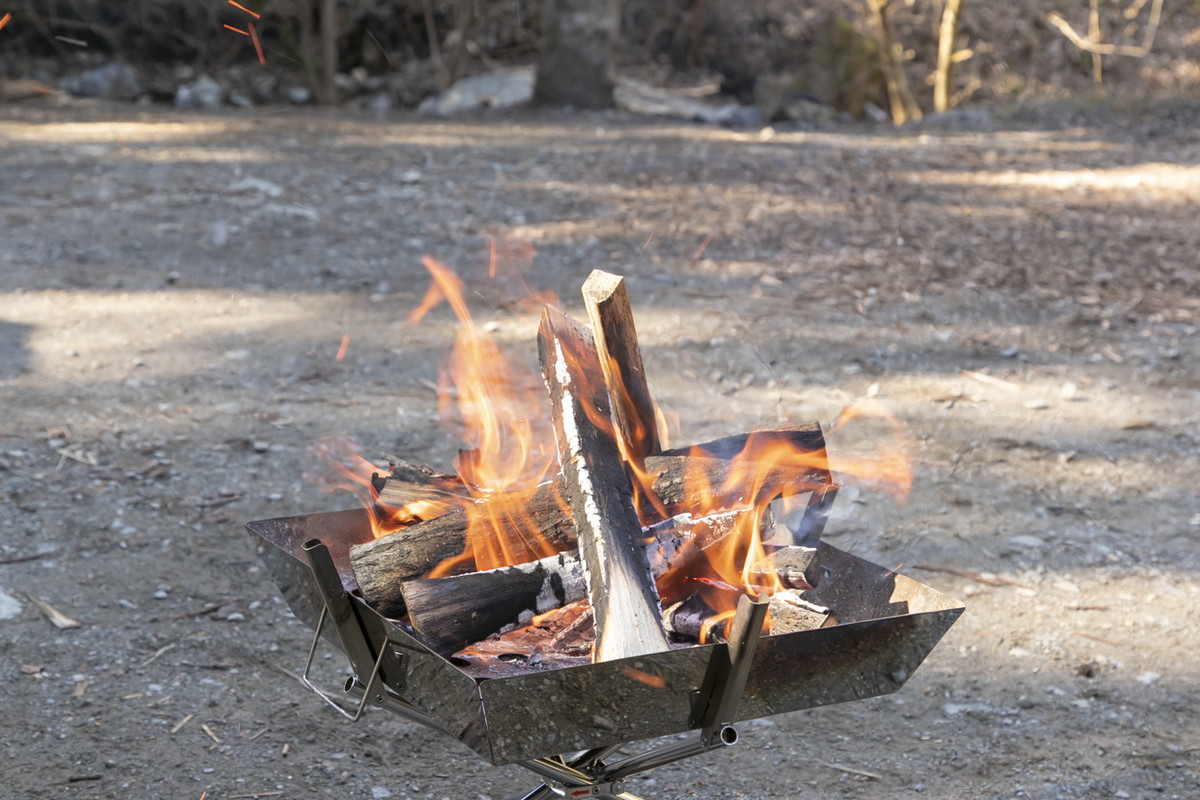 写真は、枕木を底に置いてその上に薪を並べる「並列型」です。閉じ傘を低くした「開き傘」も同様に、長く焚き火ができます。