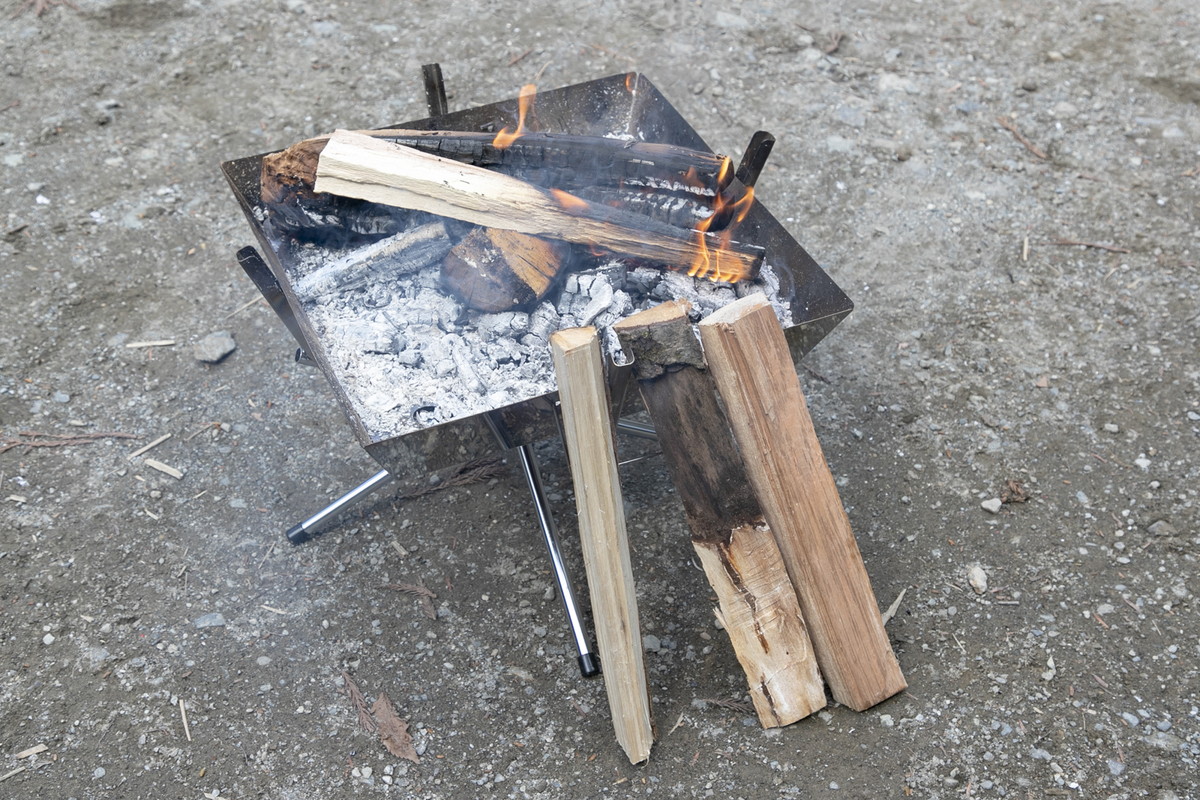 水分が多い薪は、煙が出やすい上に燃えづらい! 焚き火にくべる前に焚き火台の周囲に立てかけて、乾かしてから使います。