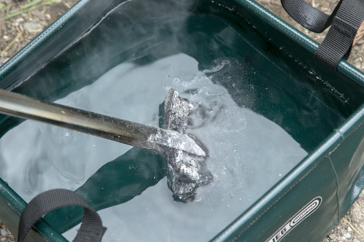 薪は燃やし尽くすのがベストですが、キャンプ場のチェックアウト時間が迫っていたり、早く眠りたいときなどは強制終了。薪の炎が落ち着いたら、1本ずつたっぷりの水に浸けて確実に消火します。あとは指定の灰捨て場で処理しましょう。