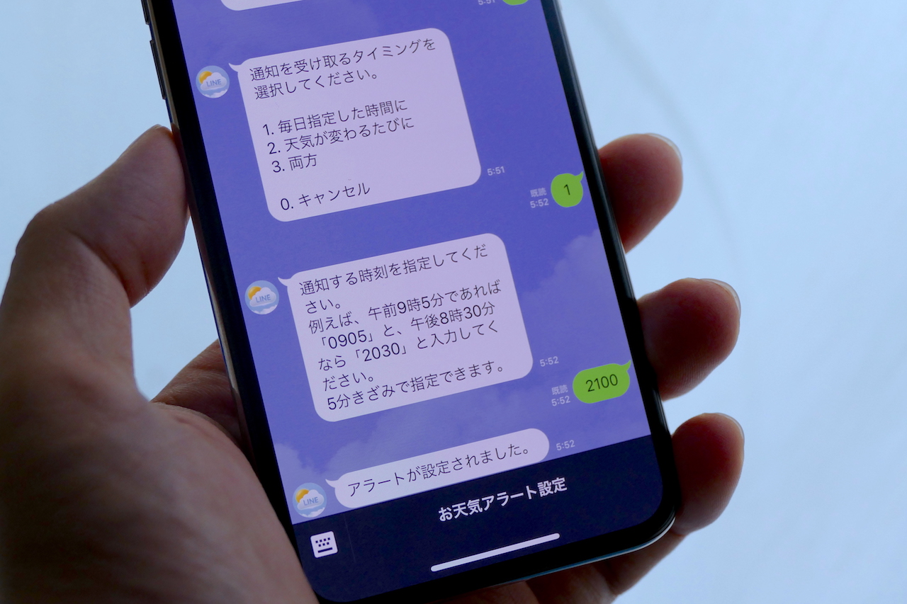 テキストで入力した地域の天気予報について教えてくれるほか、あらかじめ設定しておくことで指定の時間に特定のエリアの天気予報を毎日通知してくれるので、重宝します。