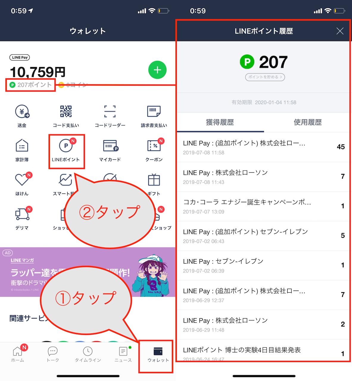 ▲「LINE」アプリを起動し、「ウォレット」タブをタップして、「LINEポイント」のアイコンを選択する。ちなみに、ウォレット画面でポイント残高をタップすると獲得履歴を確認できる