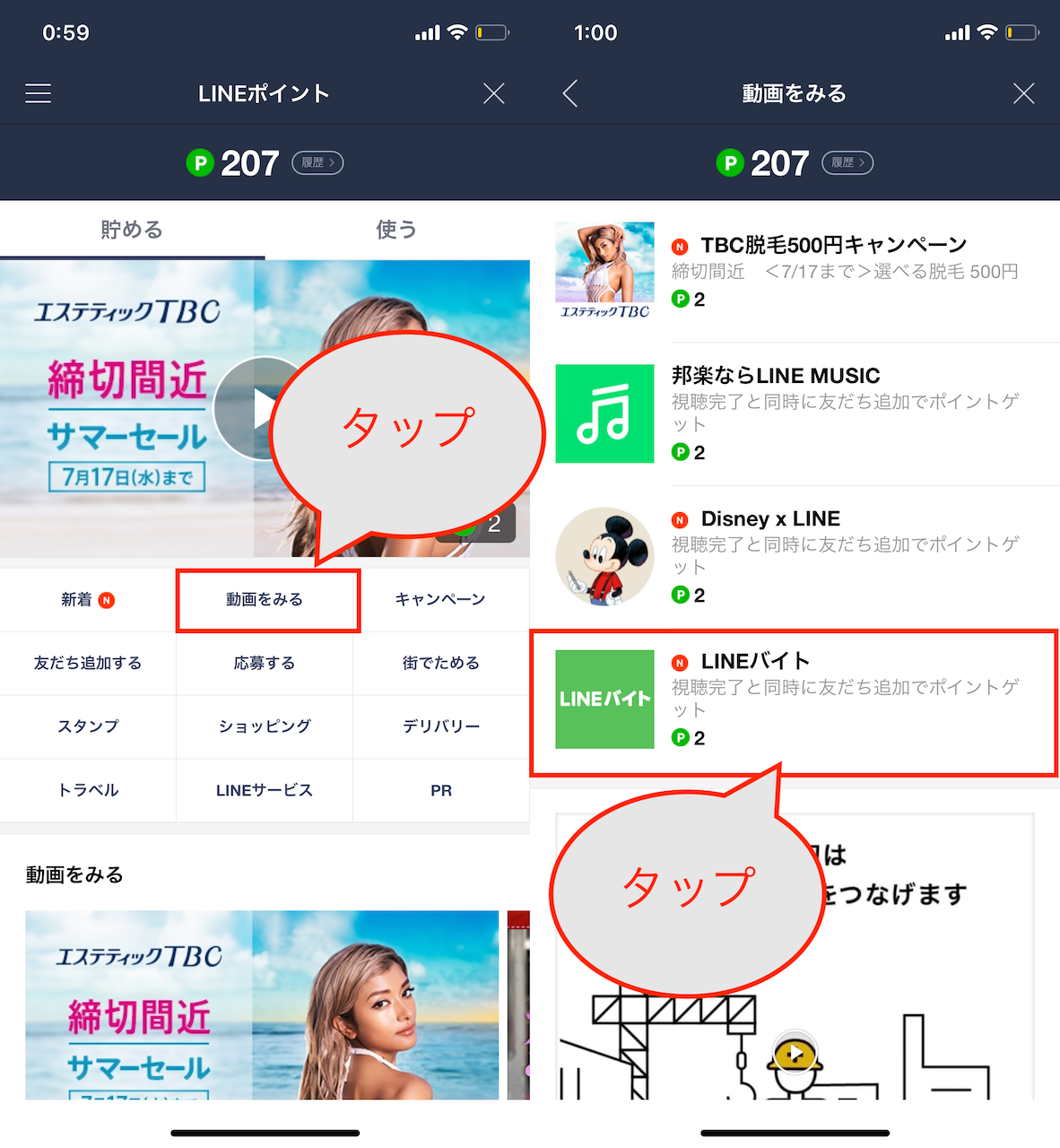 ▲最初に表示される「貯める」タブで、ここでは「動画をみる」をタップ。2ポイントが獲得できる「LINEバイト」を選択した