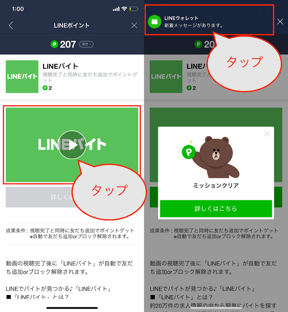 ▲「LINEバイト」の動画を視聴し、自動で友だち追加。ミッションクリア後に「LINEウォレット」のメッセージが届くのでこれを開く