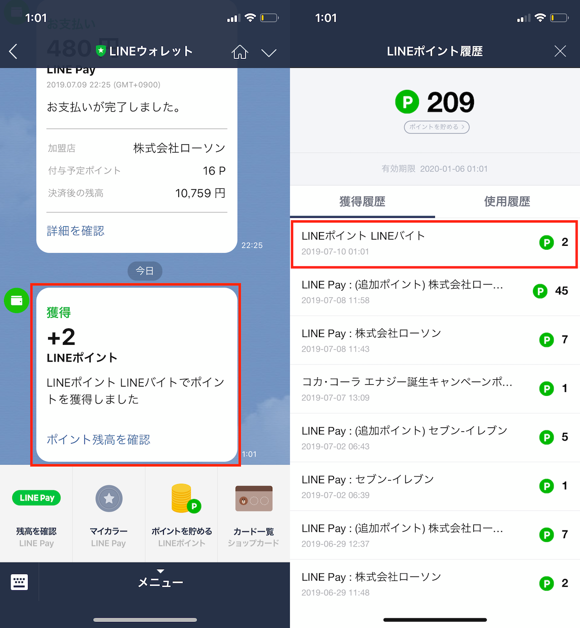 ▲「LINEウォレット」のトーク画面で、LINE ポイントを+2獲得したことがわかる。履歴を見ると「LINEポイント〜」という表記になっており、2ポイント獲得している