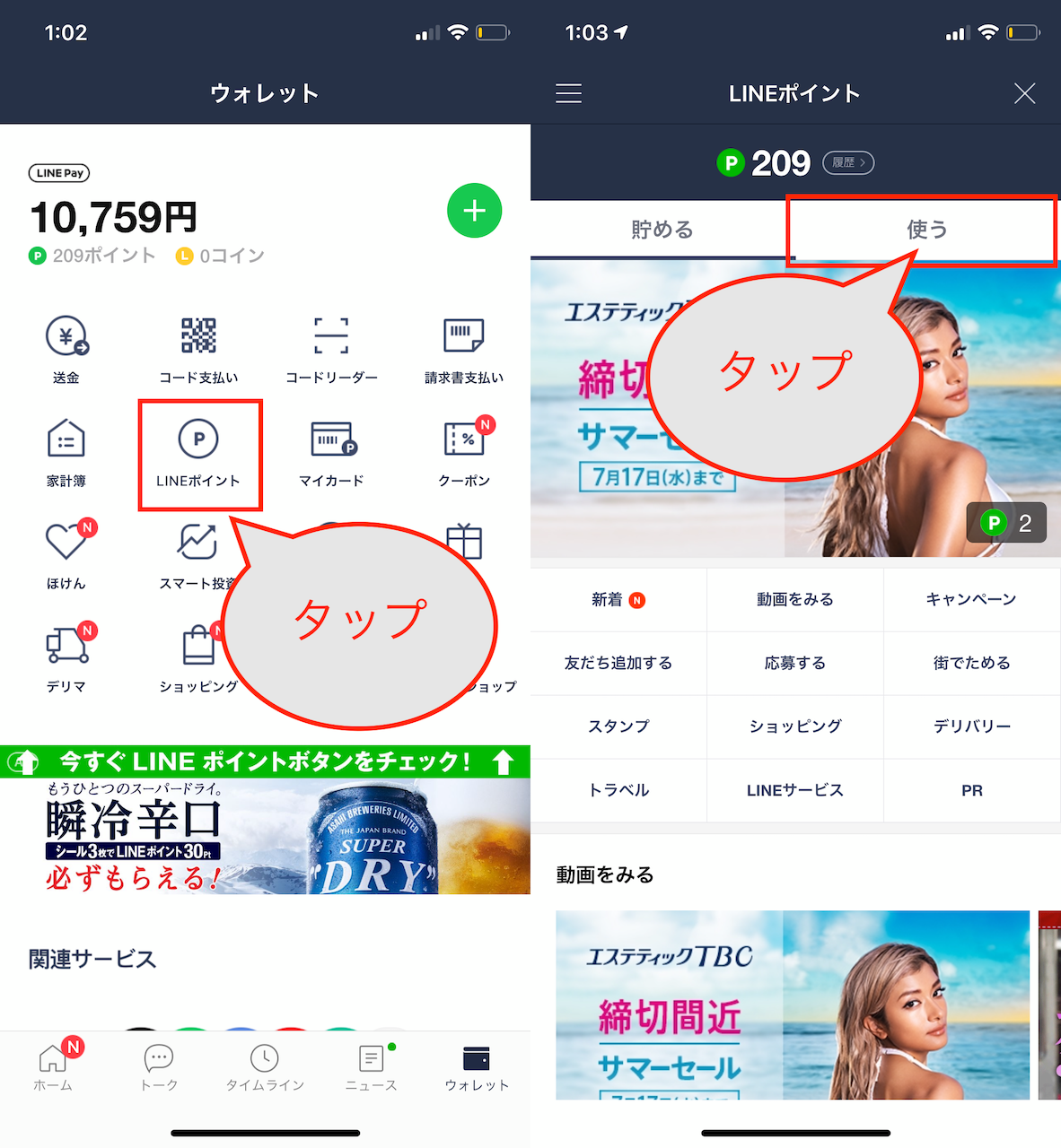 ▲「ウォレット」タブの「LINEポイント」をタップし、「使う」タブをタップする