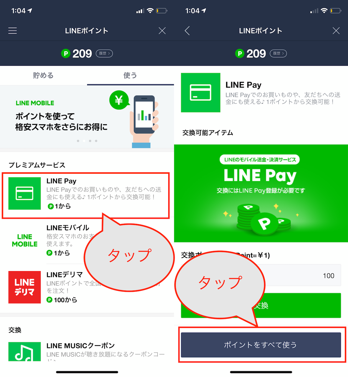 ▲「LINE Pay」をタップ。ここでは次画面で「ポイントをすべて使う」をタップした