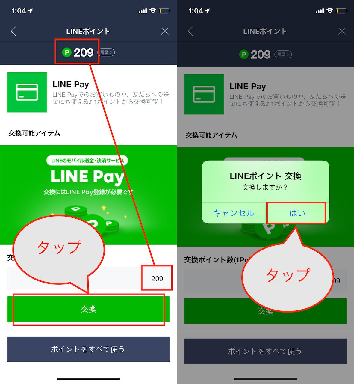 ▲交換するポイントの量を確認し、「交換」をタップ。確認画面で「はい」をタップ
