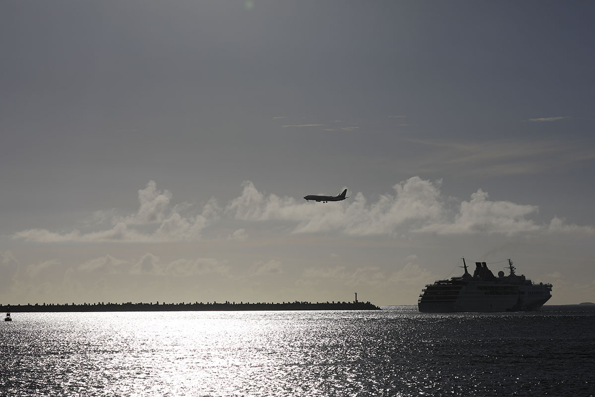 ルークさん ヒコーキ写真は"晴天"で"順光"以外、つまり逆光でシルエットで表現するのも楽しめると思います。太陽の角度によってギラギラと反射する海面を画面に取り込むことで、写真のイメージはグッと強烈になります。これも那覇の「波の上うみそら公園」ですが、夕方の西日が海を輝かせていたので、そこにヒコーキがやってくるのを待ちました。