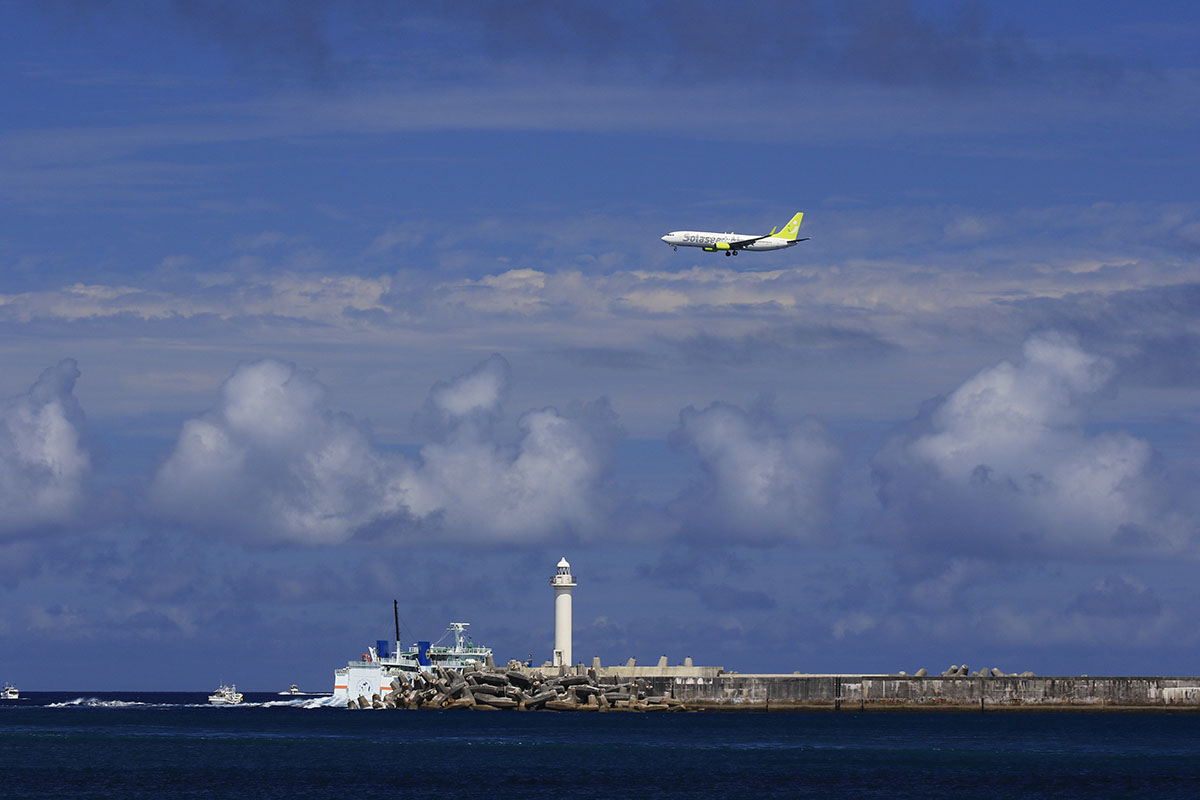 夏の那覇空港には南風が吹くので、飛行機は北側から進入してきます。なので、撮影スポットは空港近くにある「波の上うみそら公園」がオススメです。ここは標準ズーム1本で、海、空、ヒコーキが絡んだ画を撮ることができます。また、海らしさを演出できる灯台も見えますから、それをアクセントとして入れてみるのもいいでしょう。
