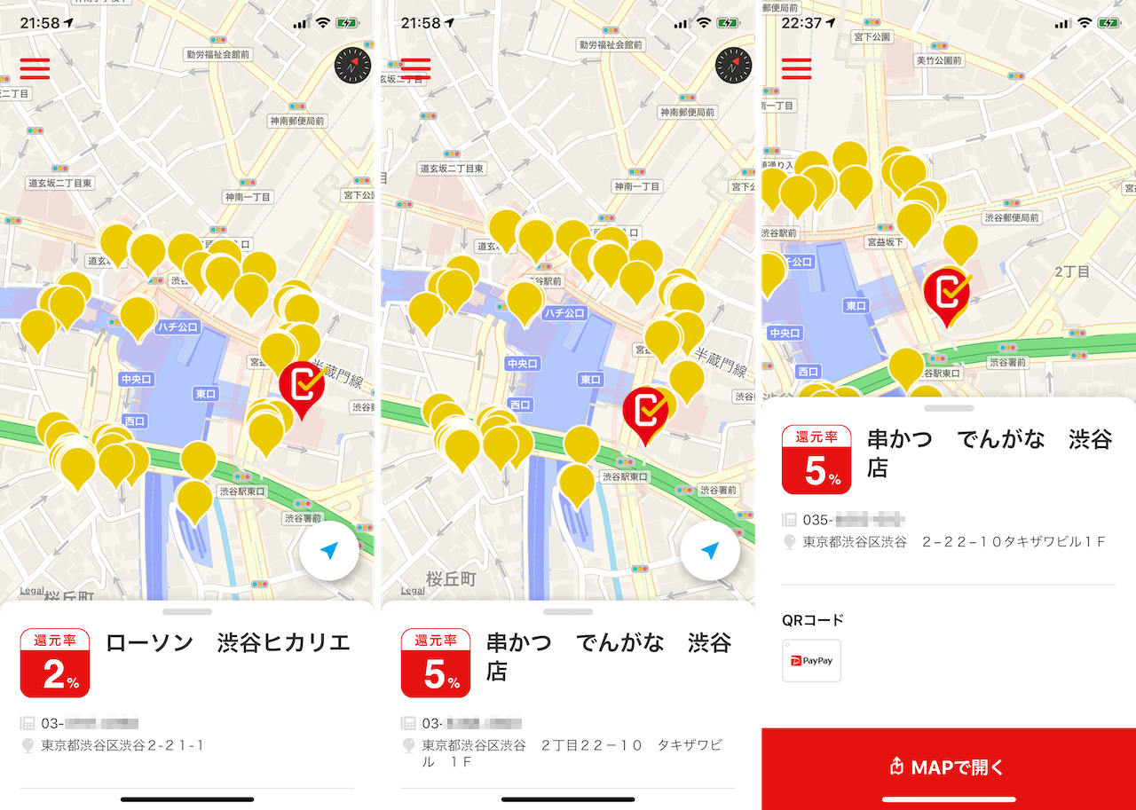 ▲対象店舗がアプリの地図上に表示される様子。スワイプアップで対象の決済方法が出る場合もある。右画面の場合には、「PayPay」が表示されているのがわかる。<※出典:キャッシュレス・消費者還元事業 ポイント還元対象店舗検索アプリの画面より作成、一部画像加工済み>