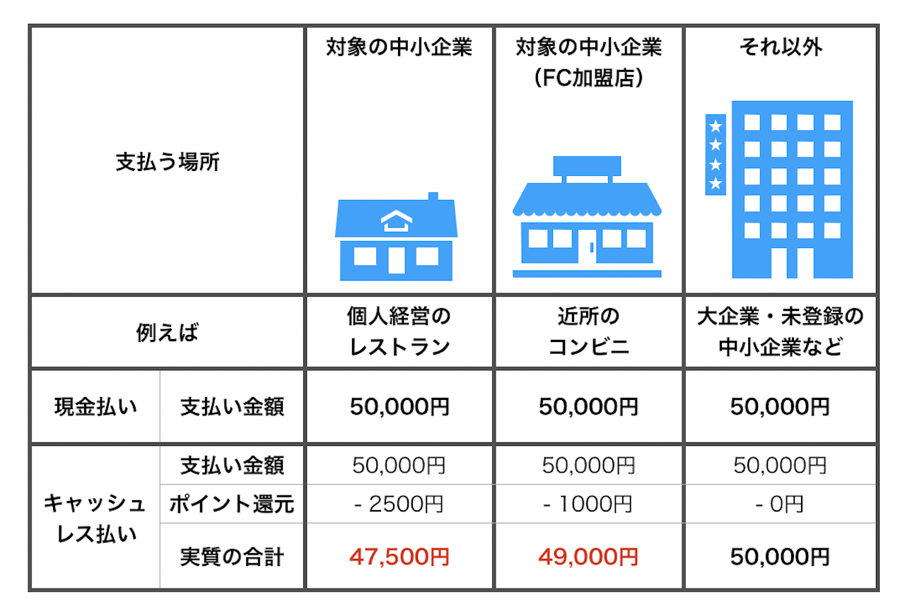 ▲現金払いとキャッシュレス払いでは、場所によって支払いに差額がでる。計算はあくまで原則的な%によるイメージ。実際にはさらにサービスの通常のポイント還元が上乗せされることが多い