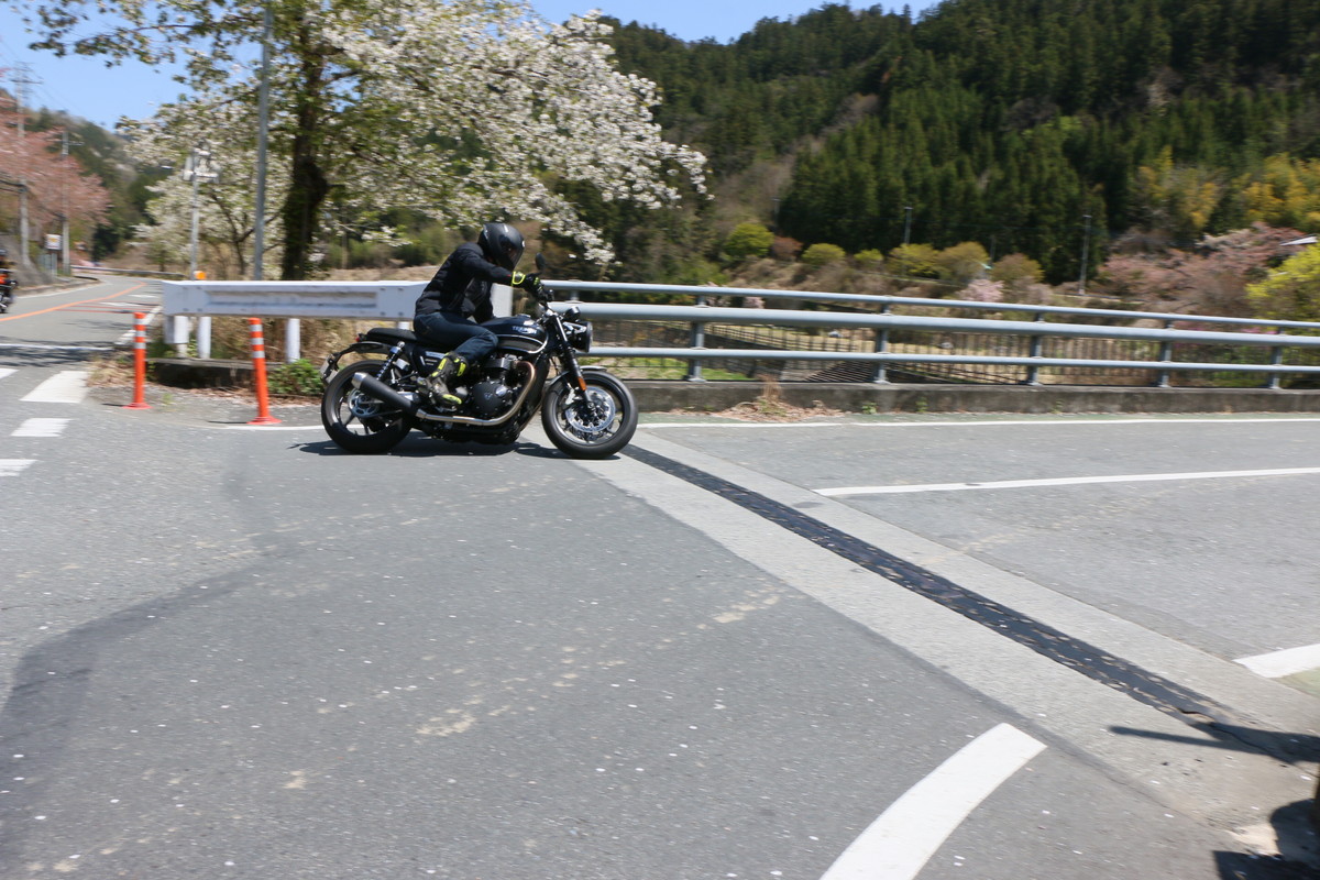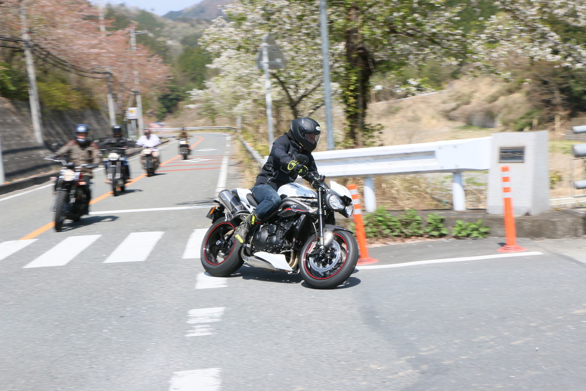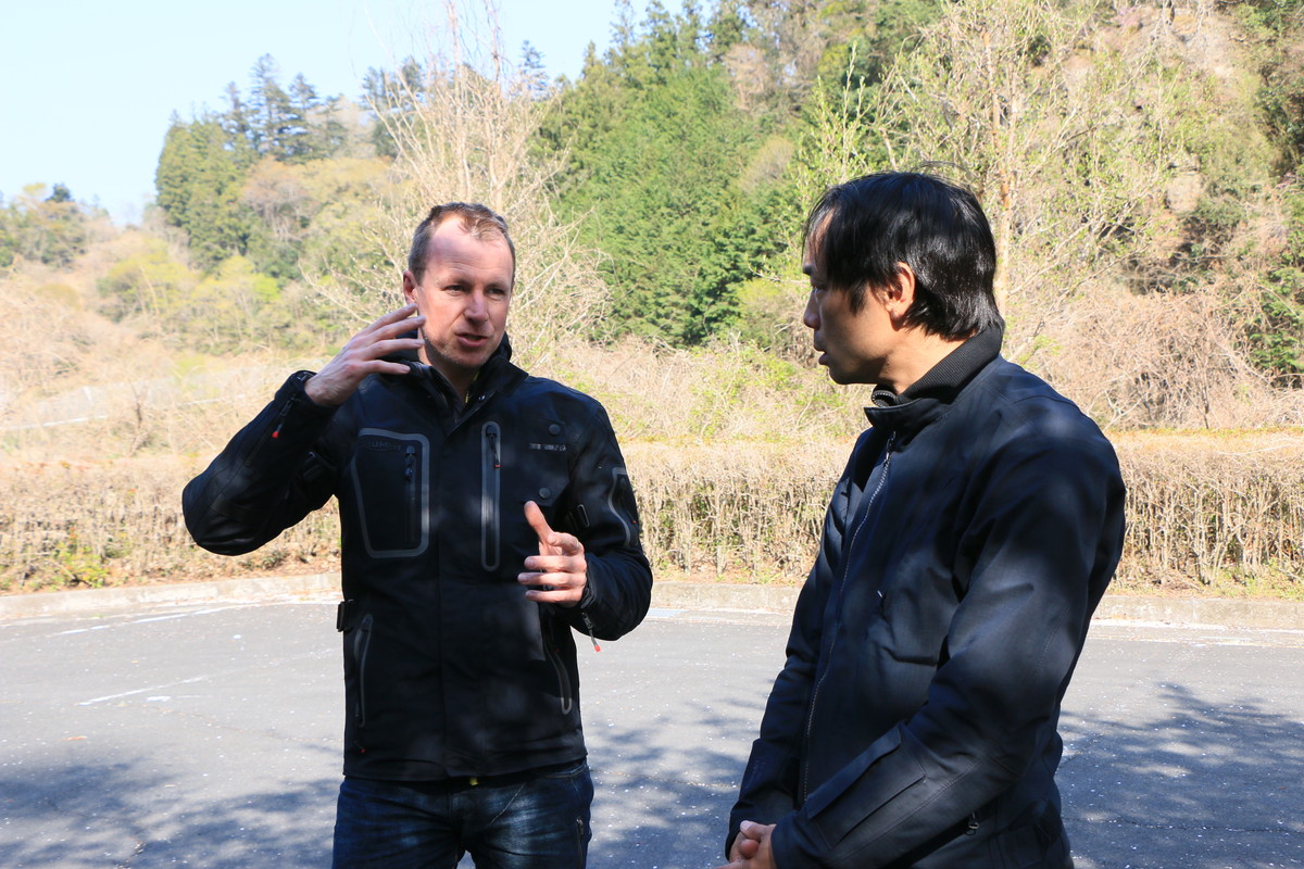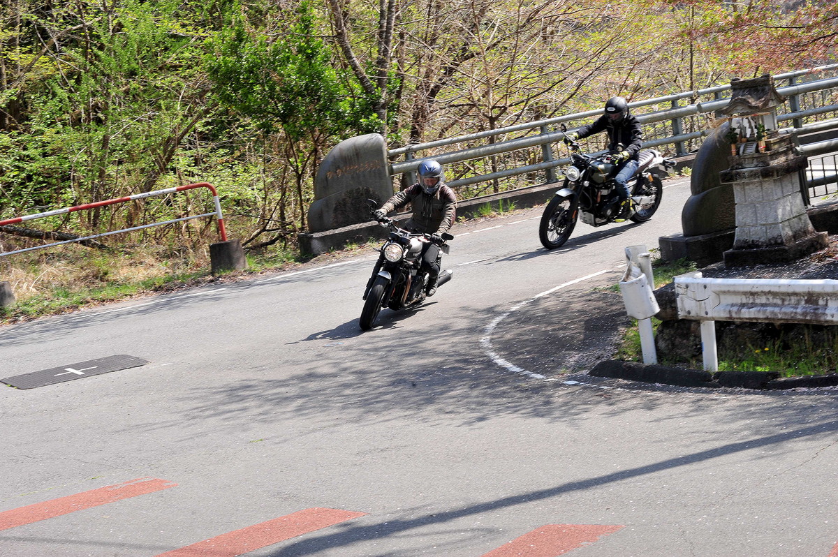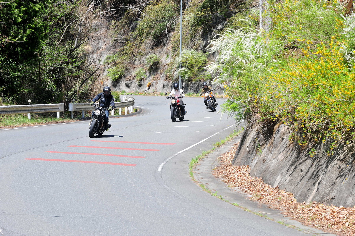 実際、筆者の後ろに付いて走ってくれた後には「見通しのいいコーナーでは、もっとラインをワイドに取ったほうがいい」とアドバイスされました。曲がりくねった峠道では、ついついセンターラインに沿って走ってしまいがちですが、狭い道幅の中でもアウト側からワイドなラインで走ることが大切なようです。常にできるだけ先の見通しを確保する事が安全性を保つ方法だという事ですね。