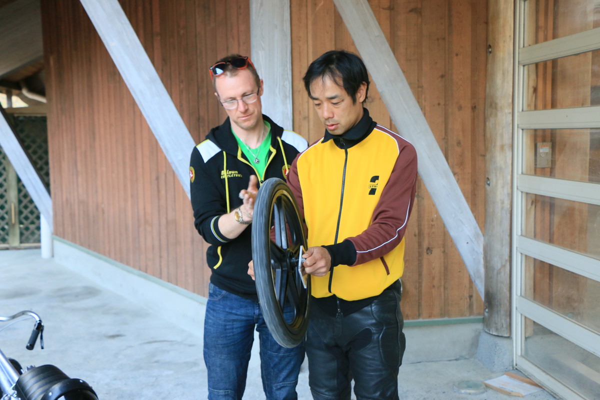 その感覚を掴むために、ちょっとした体験もさせてもらいました。自転車から外したホイールの軸を両手で持ち、回転させた状態で傾ける操作をする、というものです。「高速で回転するホイールは慣性が働いていて、傾けるのは大変なんだ。でも、少しだけ逆ステアを切ると自然と傾くのを感じられるはず」という言葉の通り、回転するホイールをそのまま傾けようとすると、結構な力が必要でしたが、片側の車軸を一瞬だけ前に押すようにすると、ホイールが逆側に傾きます。回転するホイールの慣性力の大きさと、それを操るためのコツが少しだけ体感できました。