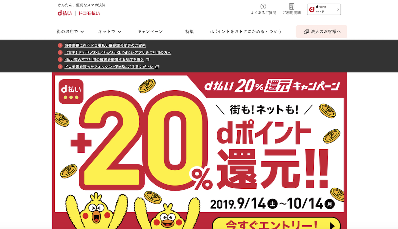 なお、19年10月14日までのキャンペーン(要エントリー)として、「d払い20%還元キャンペーン」という還元率の高いものが実施されています。利用者はこちらもチェックしておきましょう。
