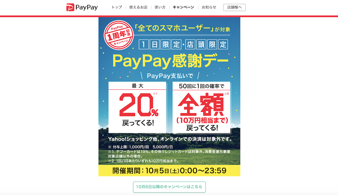 とはいえ、10月5日に1日限定で開催する「PayPay感謝デー」のように20%バックかつ10万円まで全額還元ありといったお得意の“お祭り企画”は健在。大規模な還元キャンペーンは、引き続き追いかけておくのが賢明でしょう。