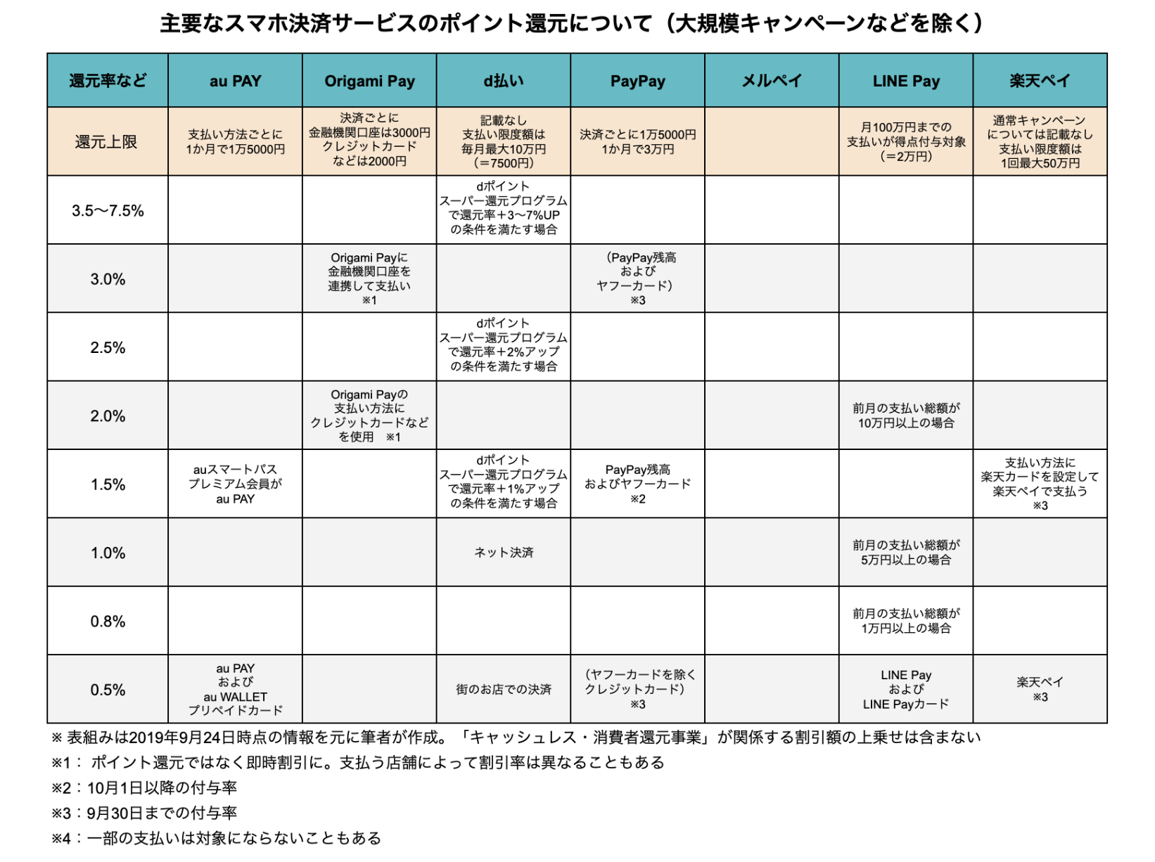 ご覧のようにスマホ決済の還元・割引については、各社でかなり違いがあり、全容を把握するのも難しいと言えます。また、19年9月末で終了してしまうキャンペーンに関しても、一部を除き、本稿では触れていません。