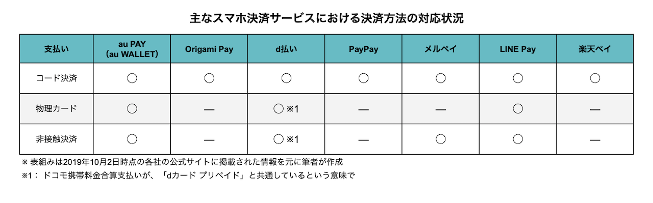 現状、支払い方式の多様さで言うと、iPhoneユーザーならau PAY、AndroidユーザーならLINE Pay、NTTドコモユーザーならd払い、メルカリを頻繁に利用しているならメルペイ、がオススメです。