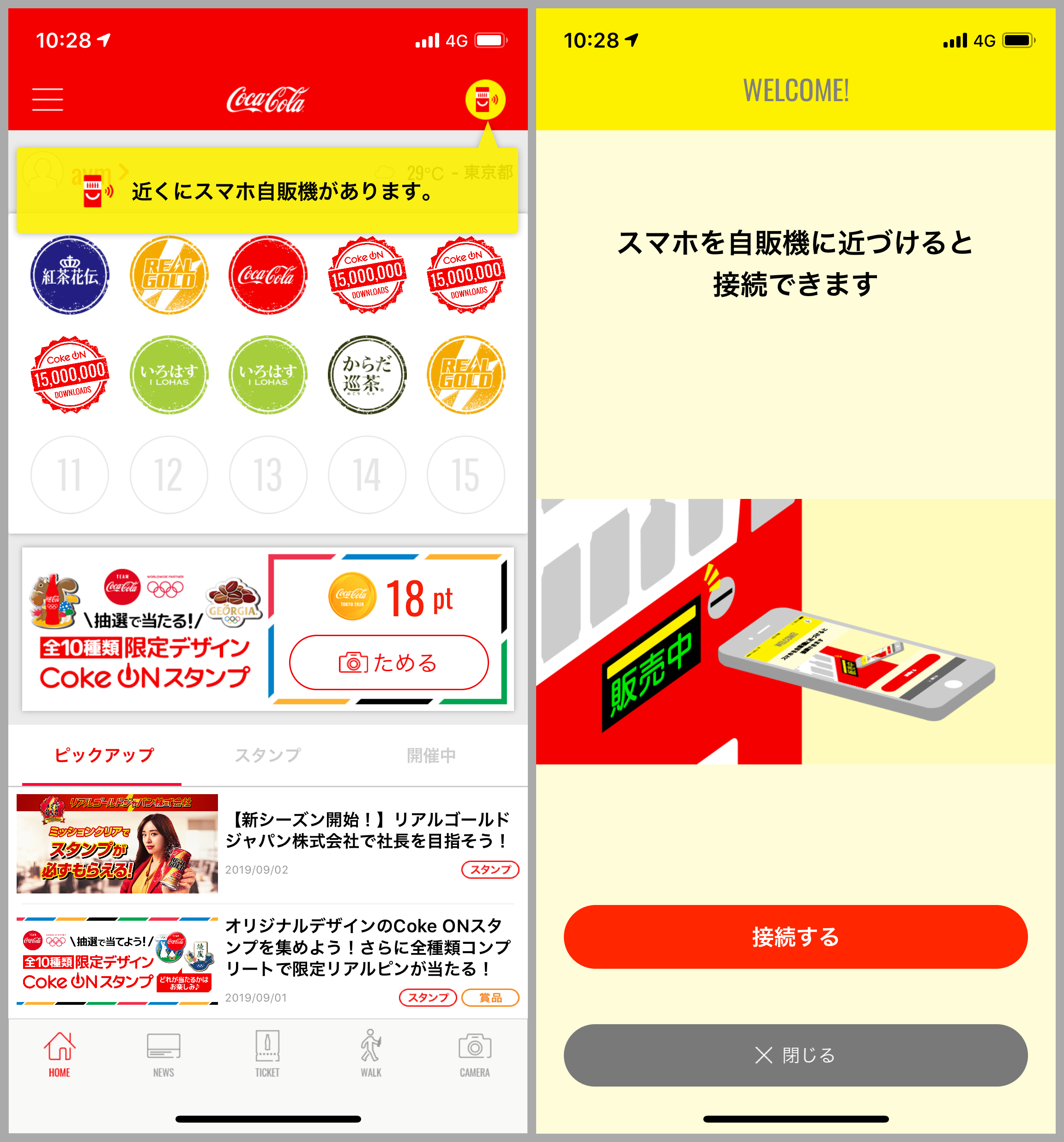 ▲アプリを起動すると、スタンプカードが表示される。近くに対応自販機があると、「近くにスマホ自販機があります。」と出てくるのでわかりやすい(写真=左)。アイコンをタップすると、接続画面が現れるので、「接続する」をタップ(写真=右)
