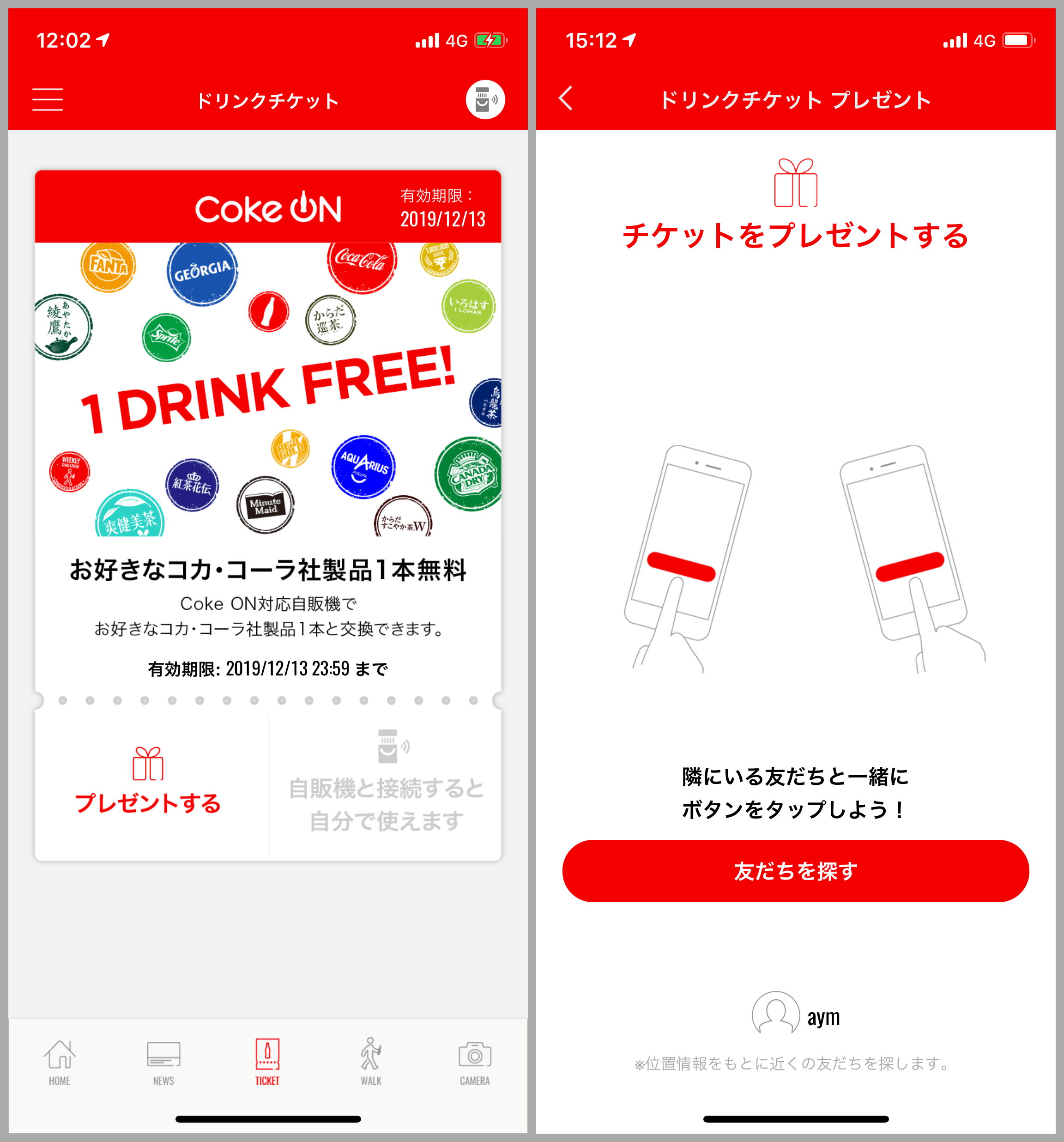 ▲引換券は自販機内のドリンクであれば値段に関係なく引き換え可能(写真=左)。近くにいる友だちにチケットをプレゼントする機能もある(写真=右)