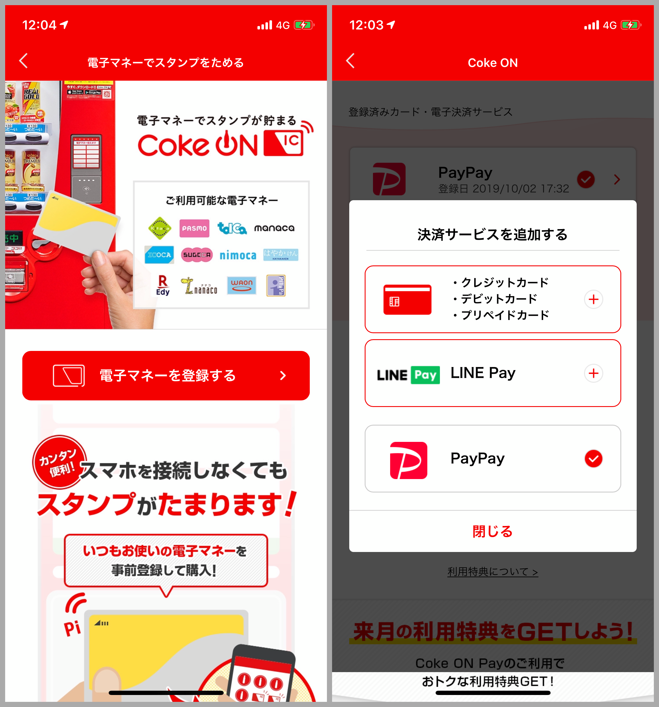 ▲電子マネーや電子決済サービスを利用した場合は、各サービスに還元される(写真=左)。最近、LINE PayやPayPayでの決済にも対応した(写真=右)