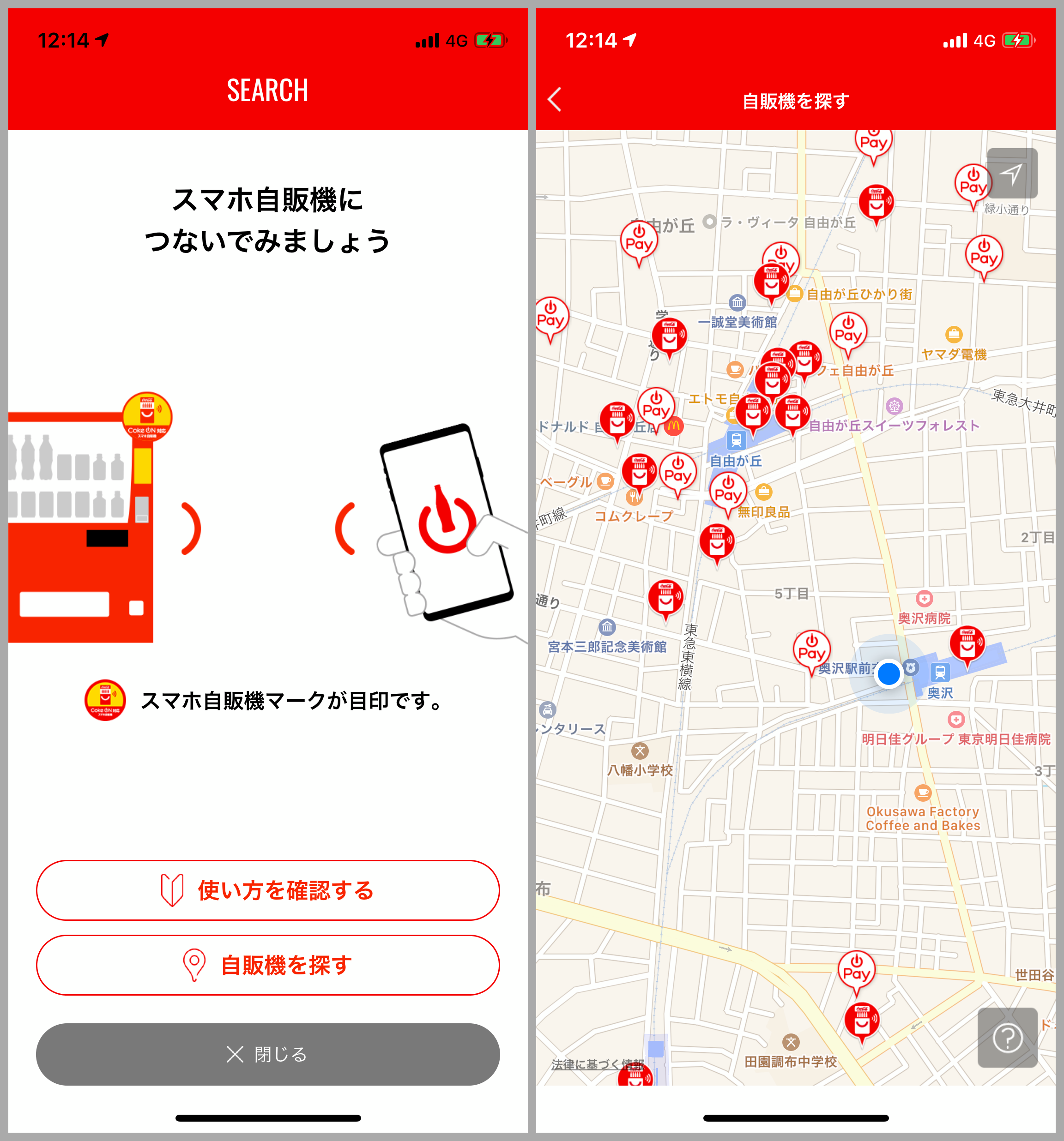 ▲近くにスマホ自販機がない場合は「自販機を探す」をタップすると、地図上でスマホ自販機を探せる