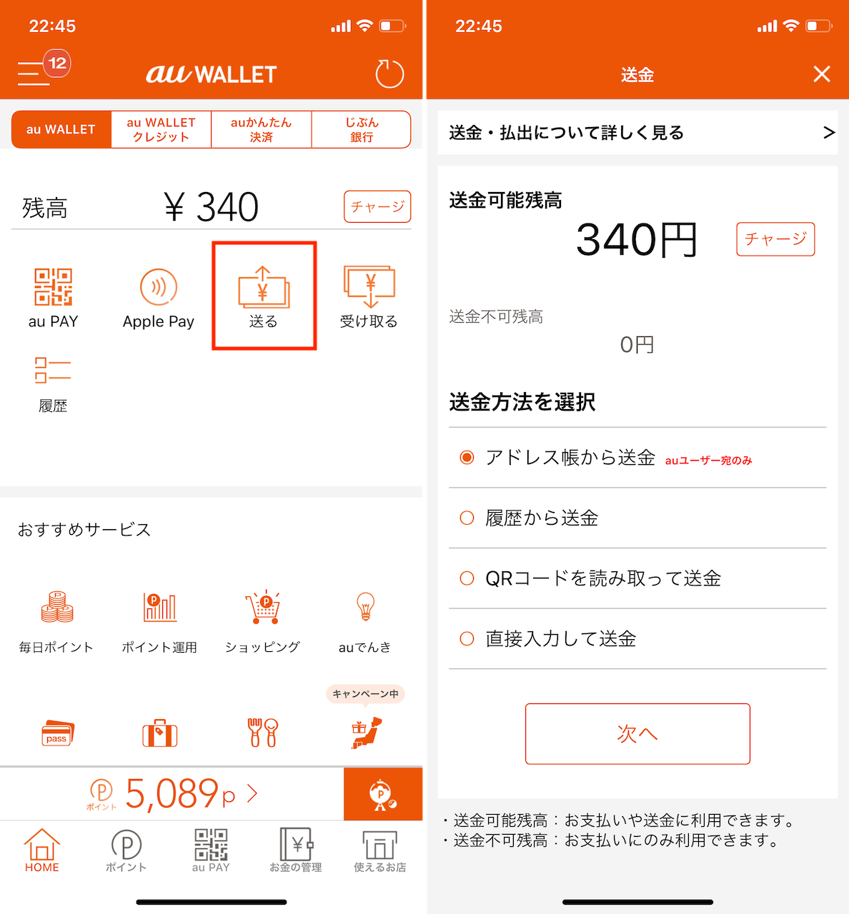 手順は、「au WALLET」アプリのHOMEタブで「送る」をタップし、送金方法を選択。電話番号やQRコードなどを利用して、残高の送金を行います。