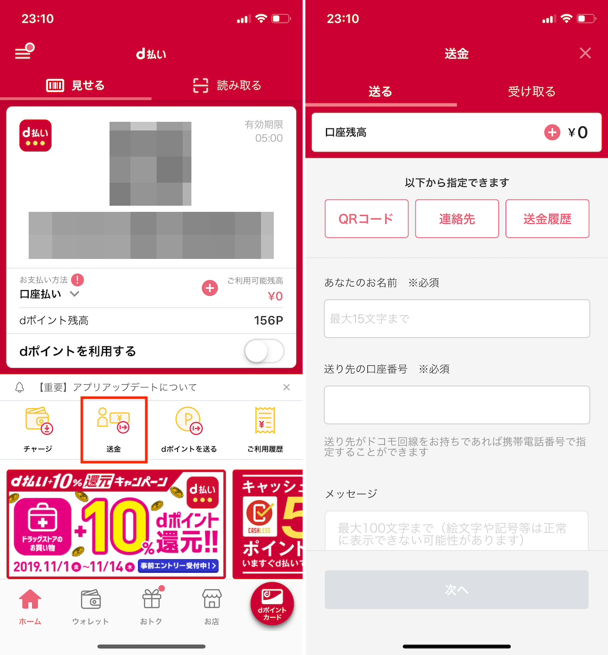 自身の名前、メッセージ、13桁の「ドコモ口座」番号(必須)を入力することで送金を行えます。なお、送金する相手がドコモユーザーの場合には、口座番号の代わりに携帯電話番号を入力しても送金操作が可能です。また、QRコードを使った送金操作にも対応しています。
