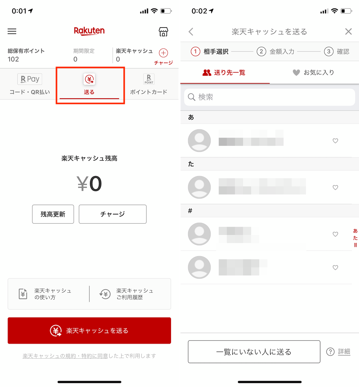 「楽天ペイ」アプリを起動し、「送る」タブをタップして、「楽天キャッシュを送る」をタップします。次画面で連絡先を指定するか、あるいは「一覧にいない人に送る」をタップしましょう。以降は画面指示通りに操作を続ければOKです。