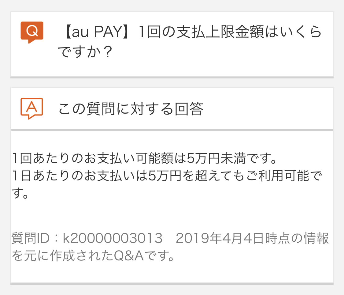 au PAYによる支払い可能な金額は、1回あたり5万円未満です。ただし、1日あたりの合計支払い金額は5万円を超えても大丈夫。