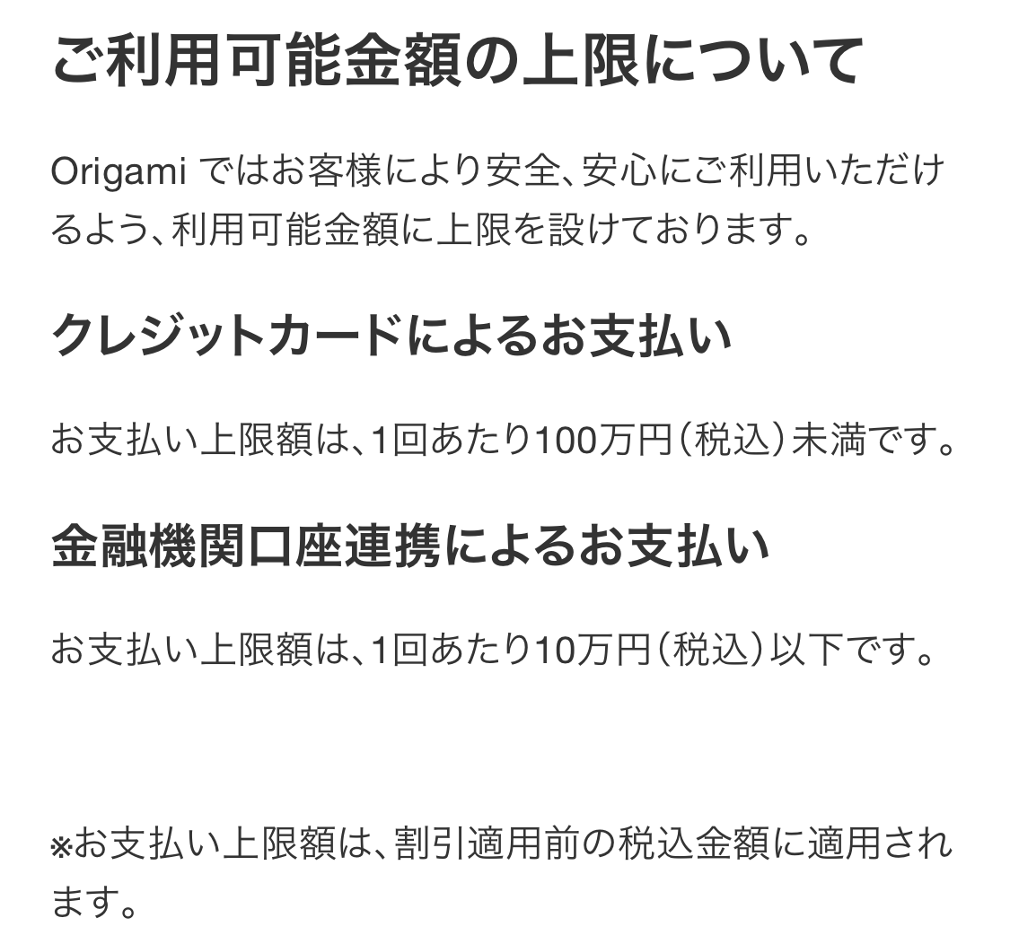 Origami Payの支払い上限金額は、決済方法によって異なります。銀行口座を連携している場合は最大10万円/回、クレジットカードを連携して支払う場合には最大100万円/回となります。