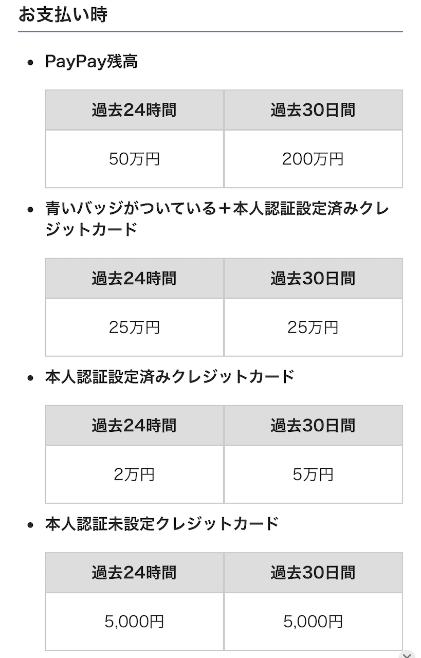 また、クレジットカードの場合は、3Dセキュアによる本人認証の設定有無によって上限金額が変化します。本人認証未設定では過去30日間で5000円まで。本人認証済みでは過去24時間で2万円まで、過去30日間で5万円まで。本人認識済みかつ青いバッジが表示された状態で過去30日間で25万円まで。