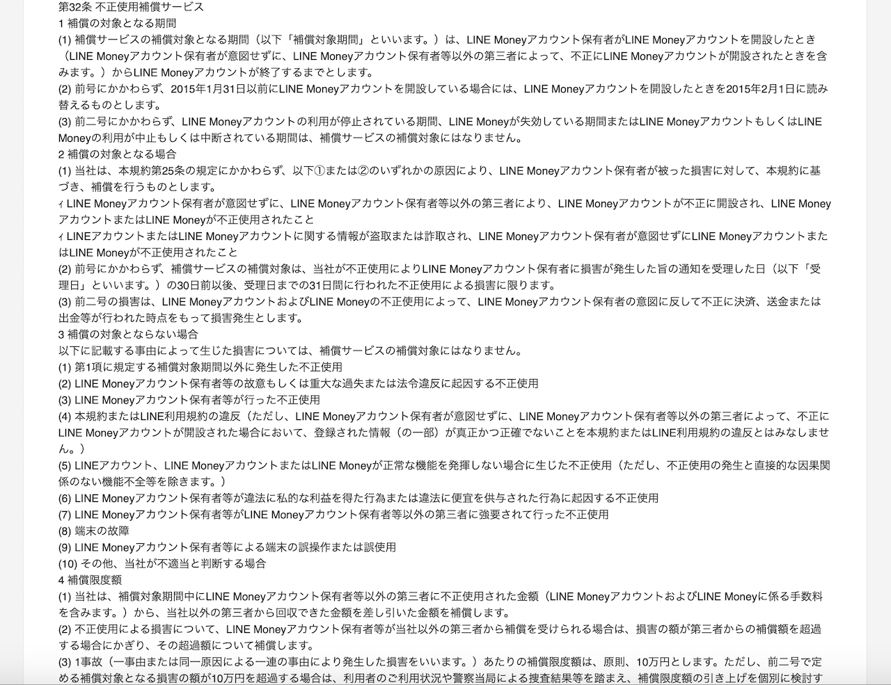 また、「補償サービスの補償対象は、当社が不正使用によりLINE Moneyアカウント保有者に損害が発生した旨の通知を受理した日(以下「受理日」といいます。)の30日前以後、受理日までの31日間に行われた不正使用による損害に限ります」との記載もあります。他サービスと比べると期間が短いので気をつけましょう。