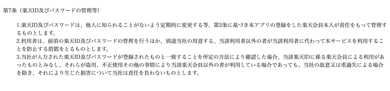 楽天ペイ利用規約には、「当社が入力された楽天ID及びパスワードが登録されたものと一致することを所定の方法により確認した場合、当該楽天IDに係る楽天会員による利用があったものとみなし、それらが盗用、不正使用その他の事情により当該楽天会員以外の者が利用している場合であっても、当社の故意又は重過失による場合を除き、それにより生じた損害について当社は責任を負わないものとします」と記されています。基本的に運営側の責任がない損害については、補償されないと思っておきましょう。