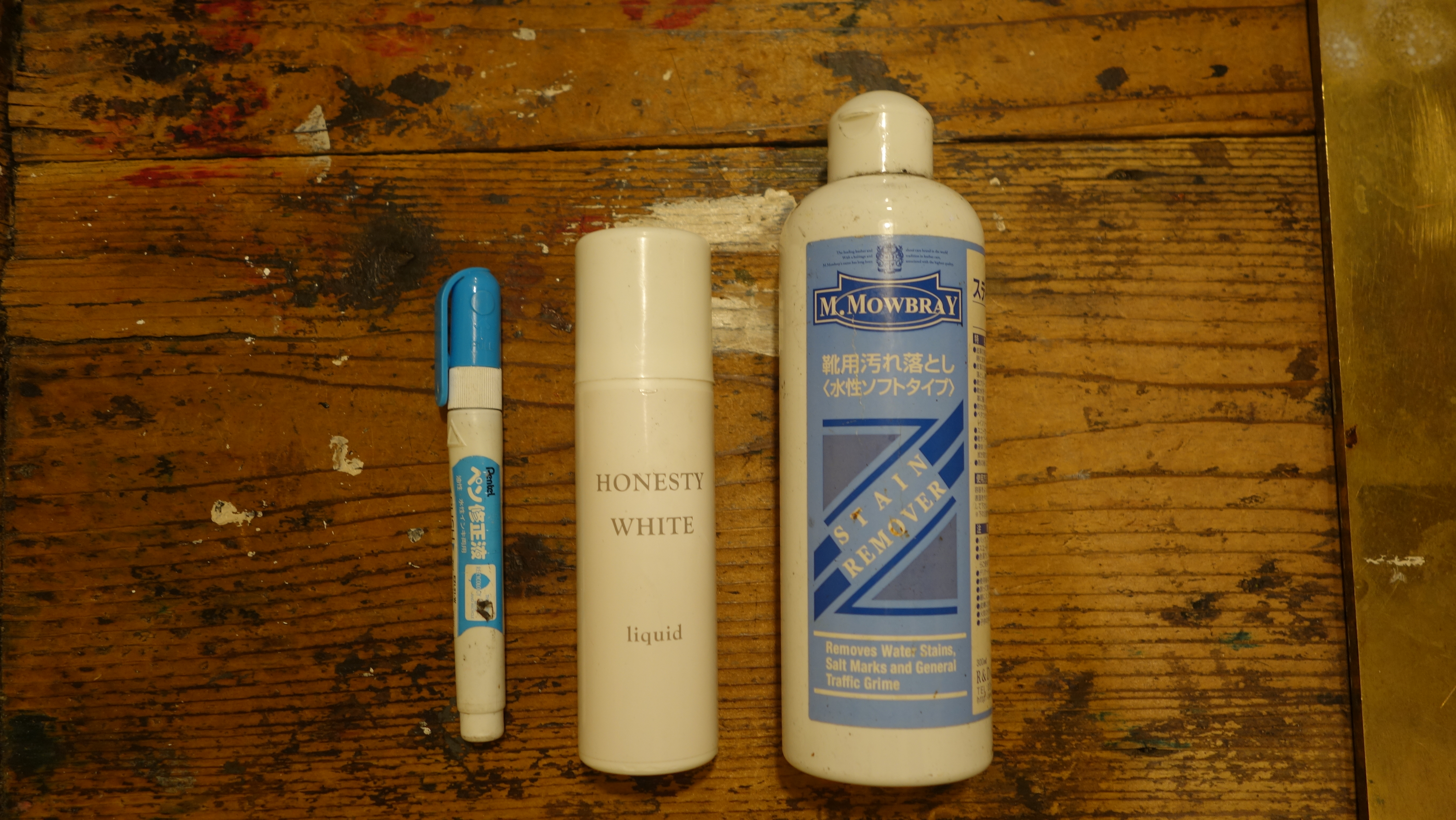 今までの工程でも、どうにもならない時のために教えてもらった裏技的なアイテムが “修正液”。白い顔料でもこれが身近でコスパにも優れているのでおすすめだそうです。ただ、補色カラーリキッドに比べて色が濃いため、馴染ませるのにはテクニックが必要。なので、本当にどうしても気になる場合だけ目立たない場所で試してから使用しましょう。