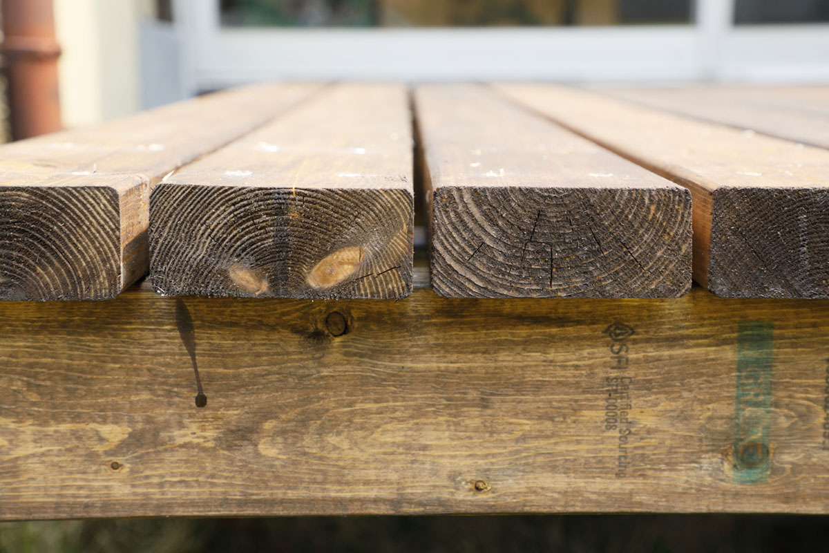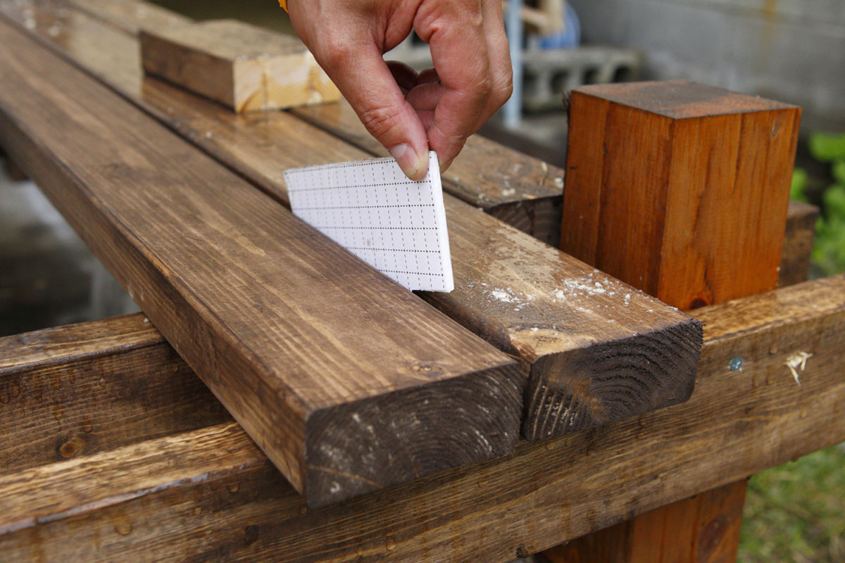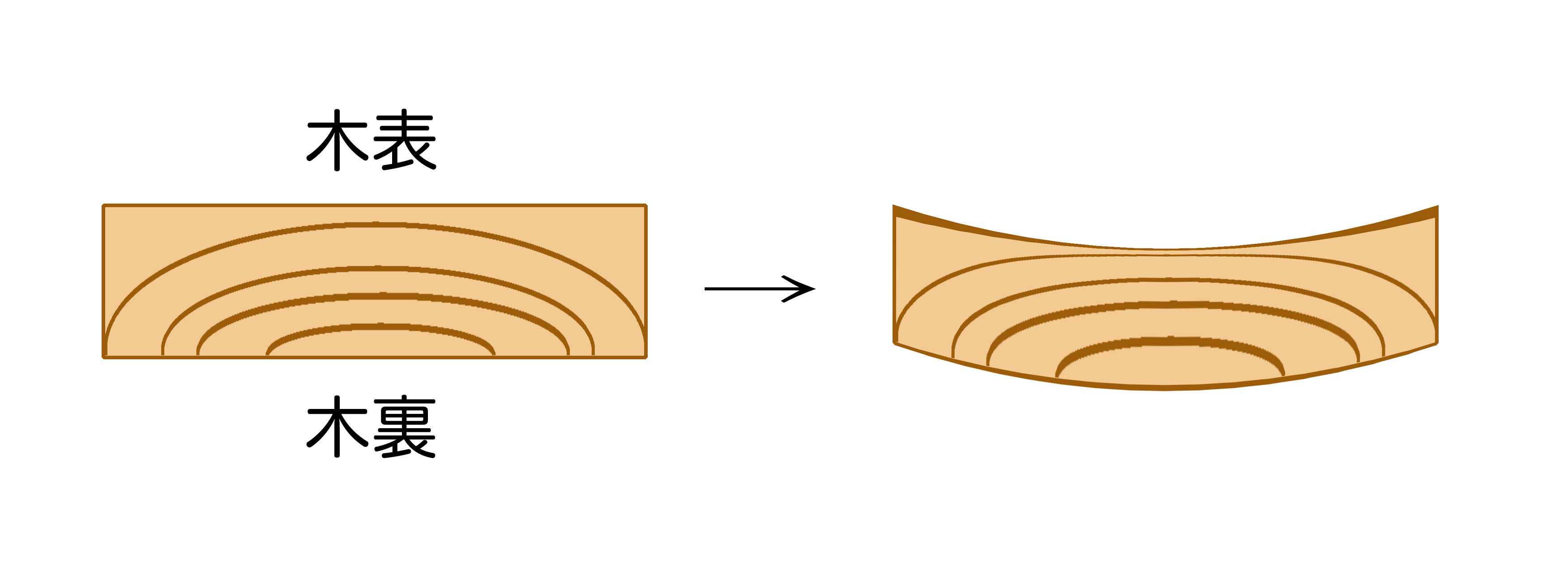 材木は乾燥するにしたがい、反りがでて変形する。板状の材の場合、木裏側に膨らむように反る。木表側は凹状になるため、木表を上にしてデッキを張ると、そこに雨水が溜まってしまうのだ。