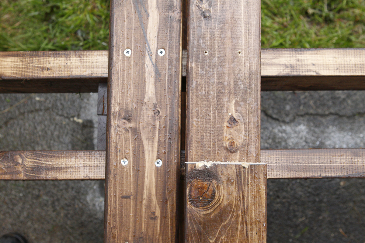 「DIYウッドデッキで見栄えが悪いのは、この横並びのネジの頭がきれいに揃ってないとこなんですよ」