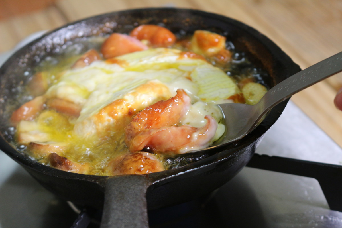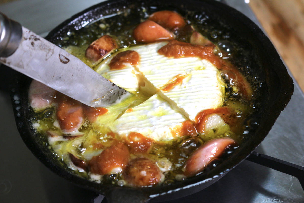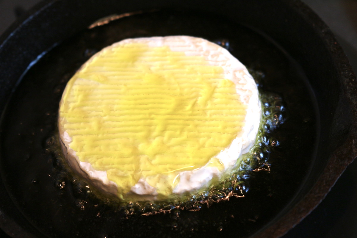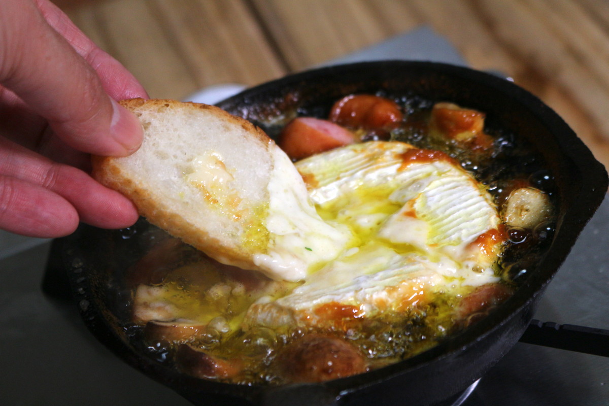 ポイントはカマンベールチーズよりほんの少し大きなスキレットを使い、オリーブオイルはチーズの半分くらいの量にすることでしょうか。オリーブオイルを入れすぎるとグツグツし始めた途端に盛大にこぼれますし、チーズが濃厚なので思った以上におなかにたまります。