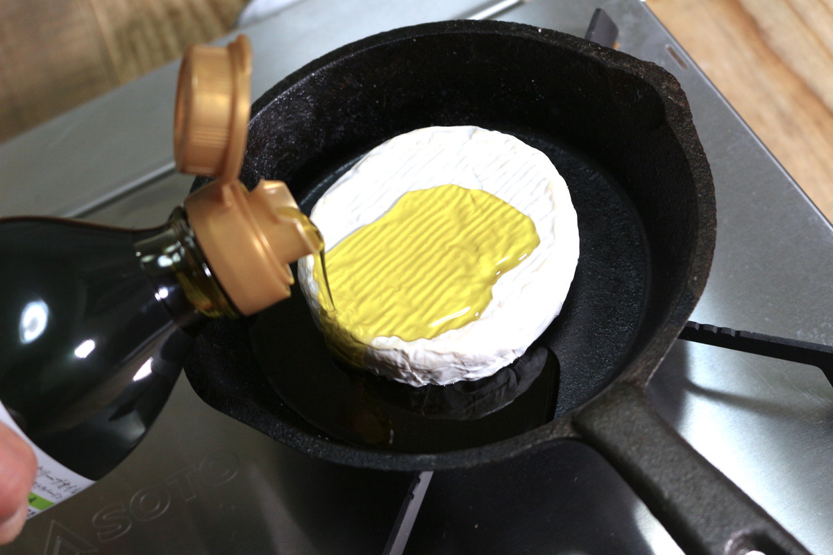 スキレットにカマンベールチーズを入れ、オリーブオイルをチーズの半分くらいまで注ぎます。
