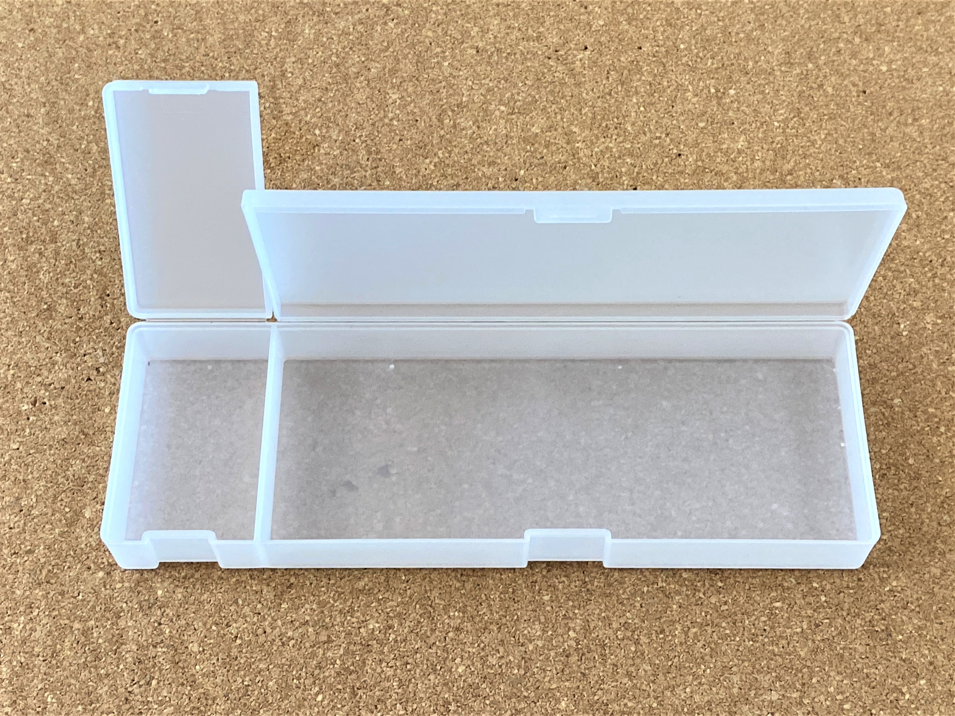 最後は、出張や旅行の際に役立つコンタクトレンズの収納方法をご紹介。使い捨てタイプのコンタクトは長期の宿泊になると数が増えてしまい、持ち運びが大変ですよね。ダブルペンケースなら、2段に重ねて10個のコンタクトを余裕で収納できます。