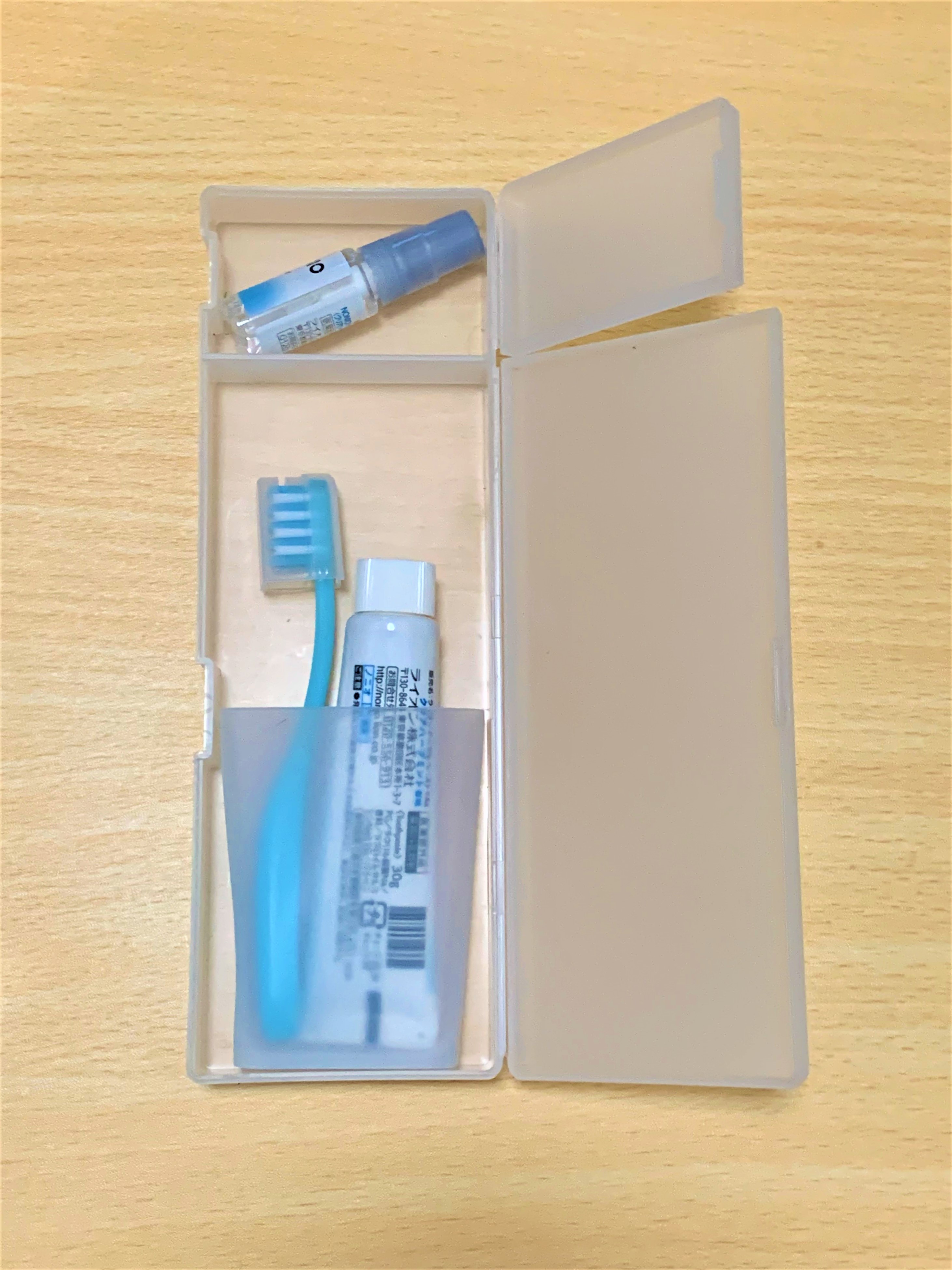 ペンを入れる部分には歯ブラシと歯磨き粉、無印良品の「携帯用シリコーンカップ」を収納。小物入れにはスプレータイプのマウスウォッシュを収納できます。