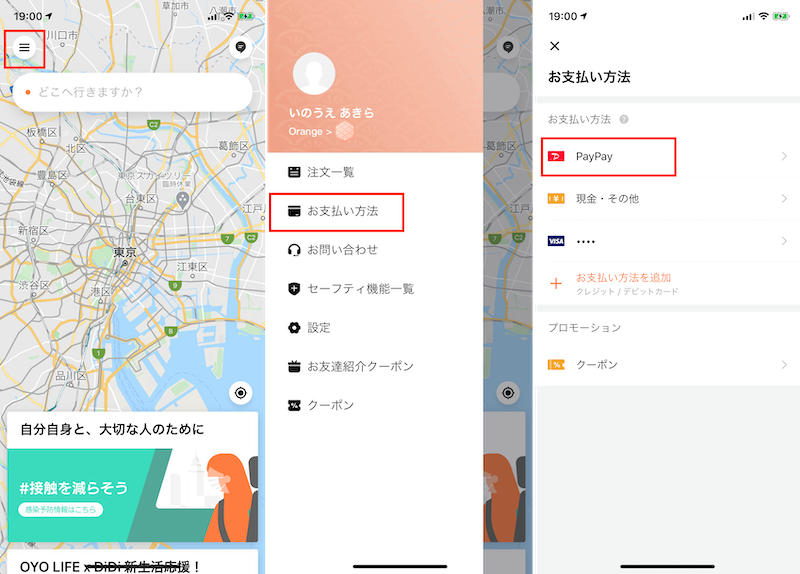 ▲「DiDi」アプリを起動し、メニューボタンから「お支払い方法」を確認すると、PayPayが連携されているのが分かる